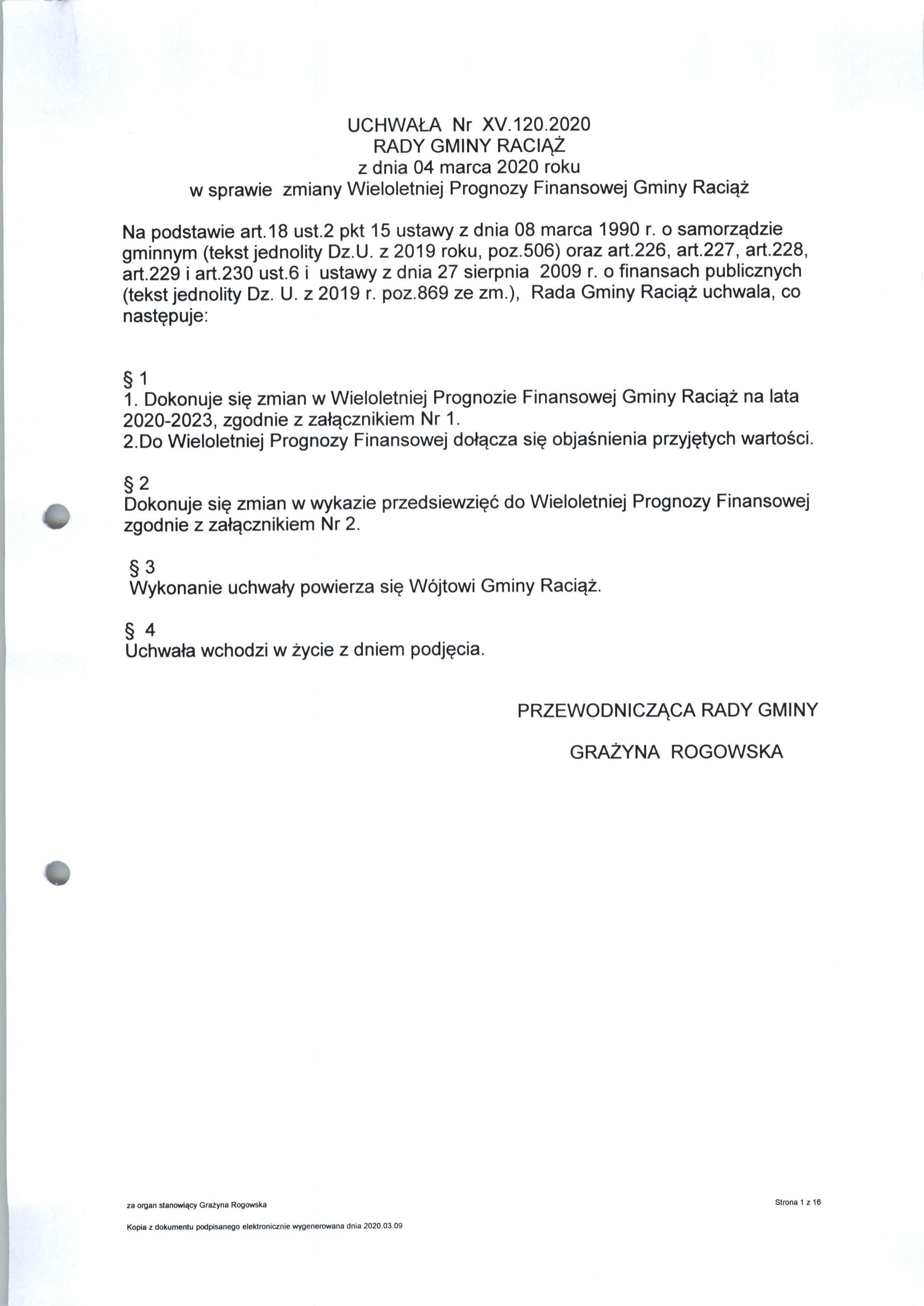 UCHWAŁA Nr XV.120.2020 RADY GMINY RACIĄŻ z dnia 04 marca 2020r20r.