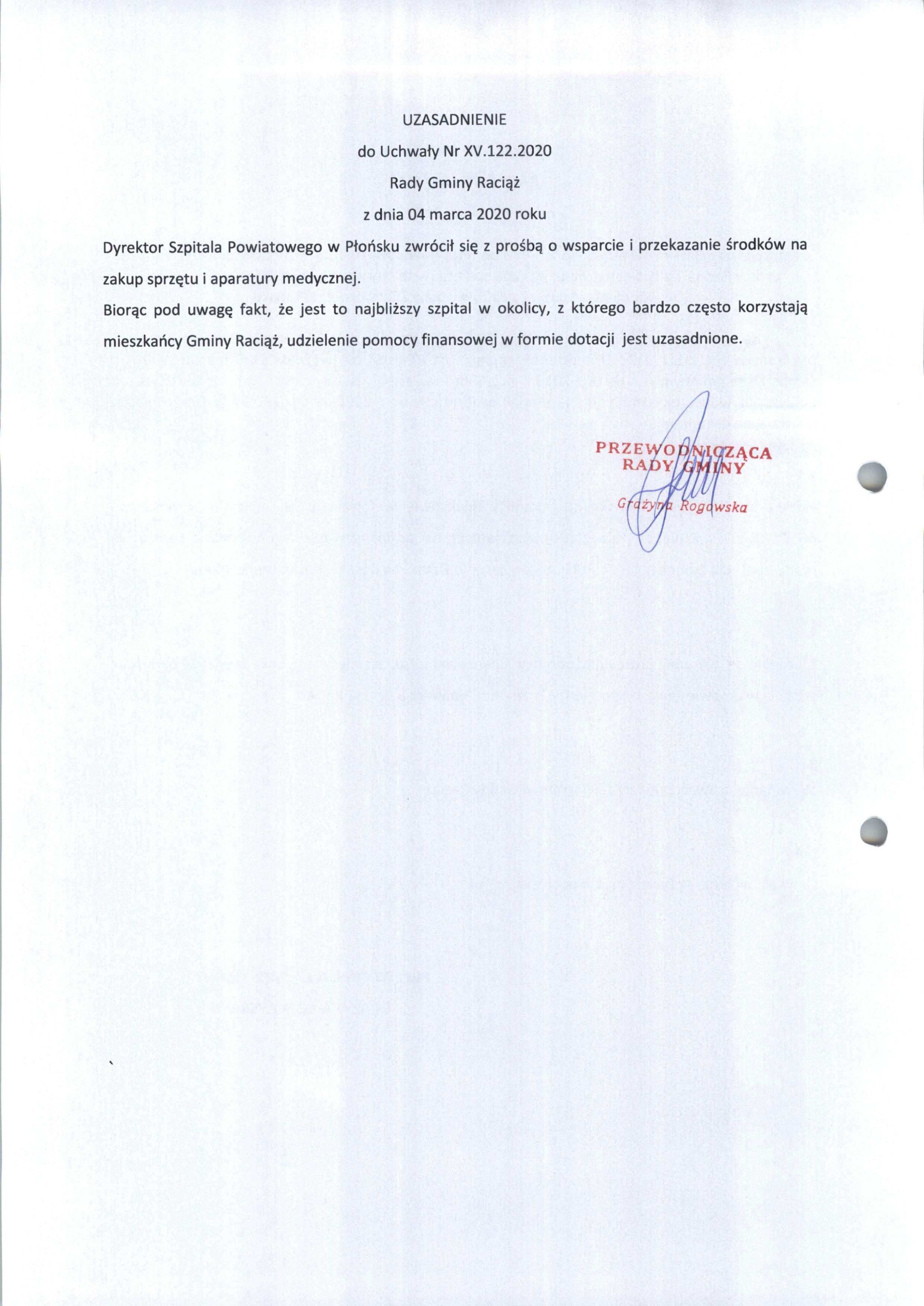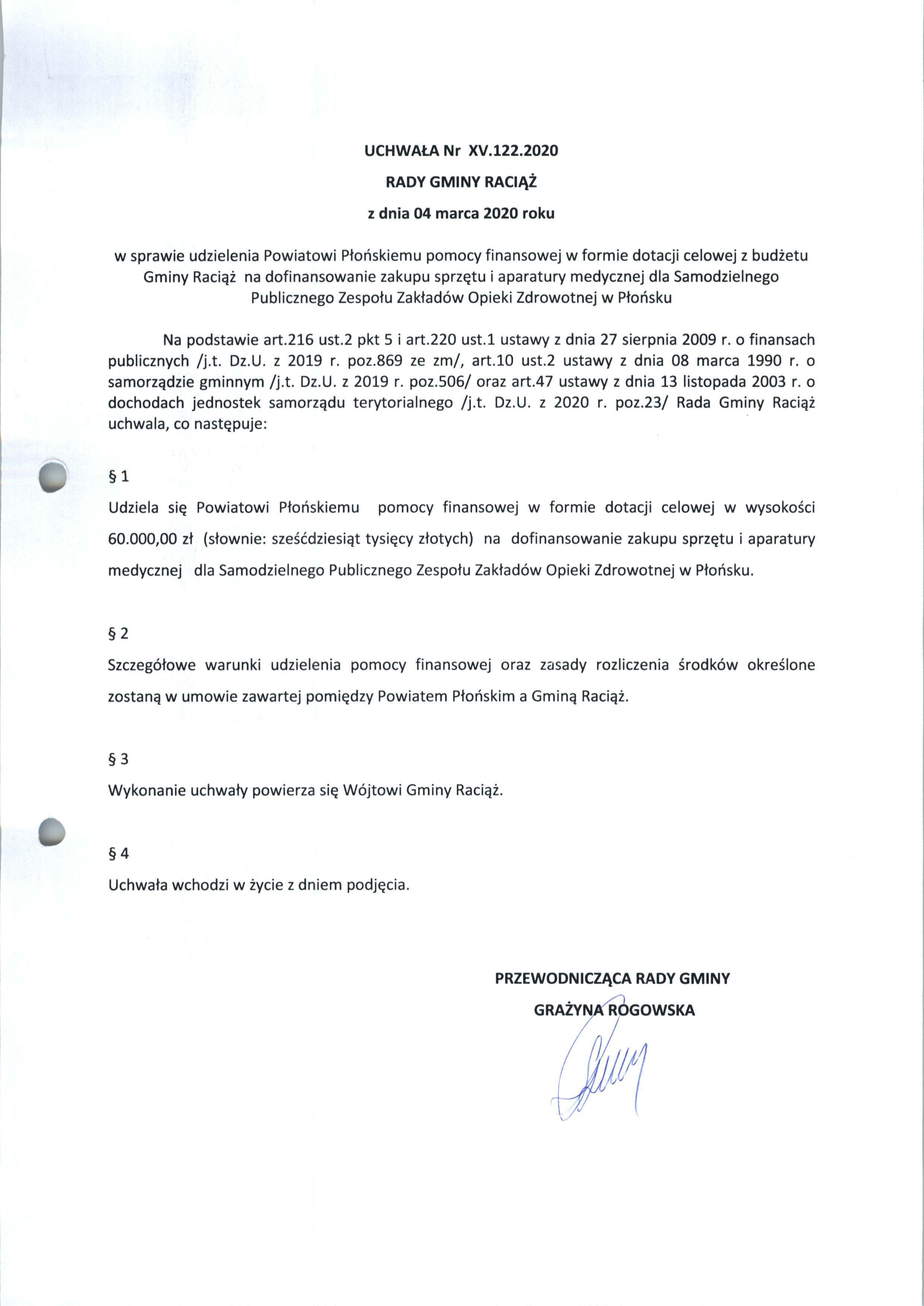 UCHWAŁA Nr XV.122.2020 RADY GMINY RACIĄŻ z dnia 04 marca 2020r
