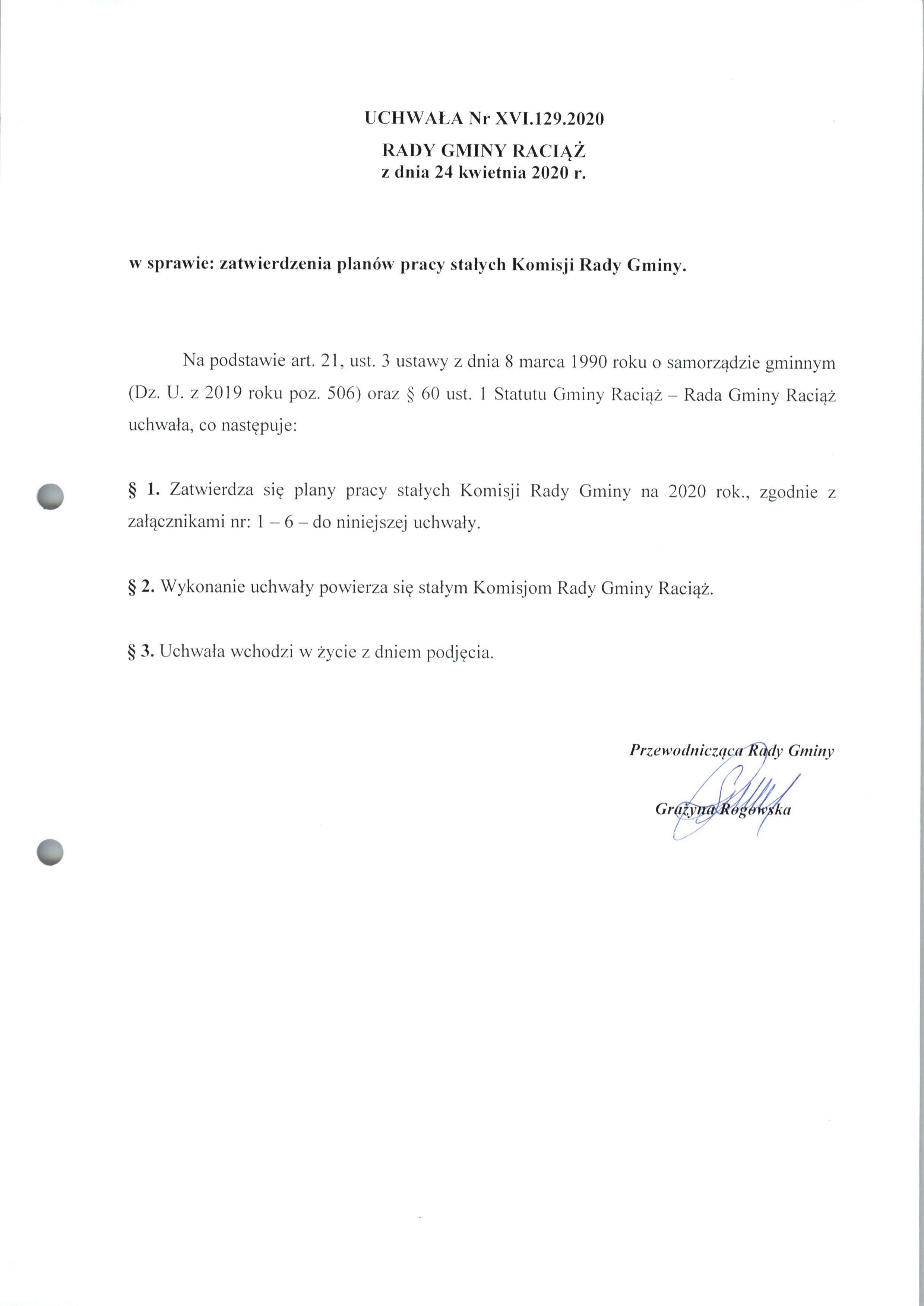 UCHWAŁA Nr XVI.129.2020 RADY GMINY RACIĄŻ z dnia 24 kwietnia 2020r.