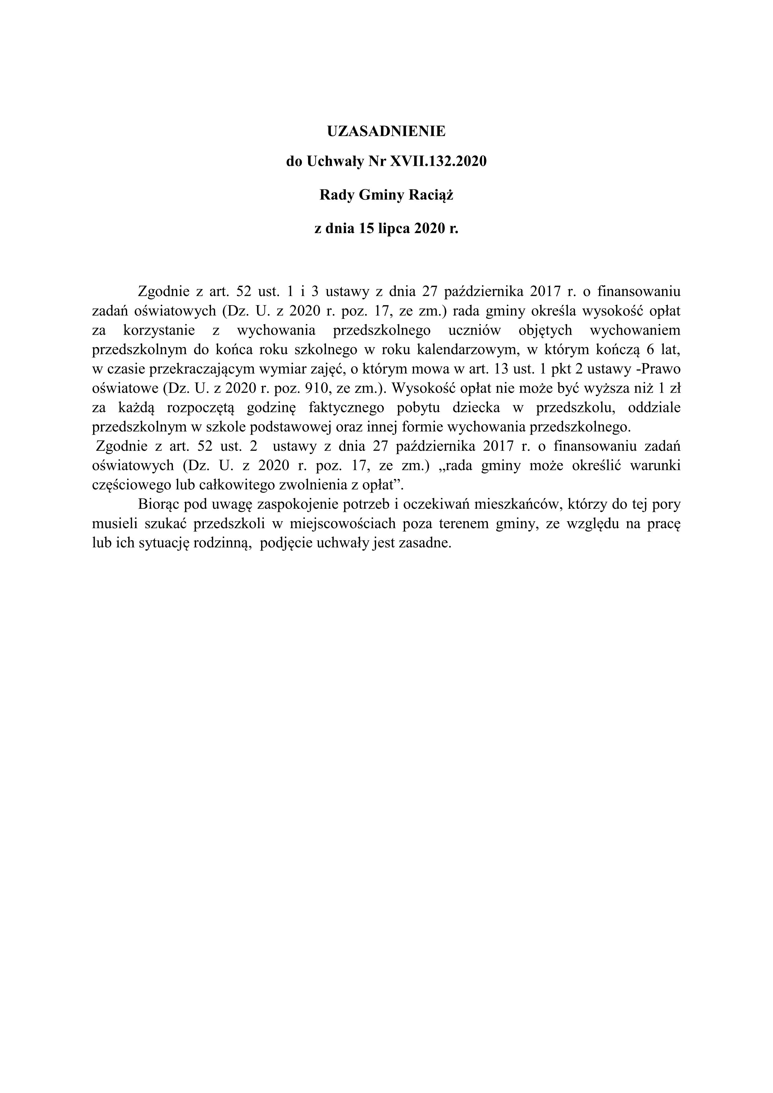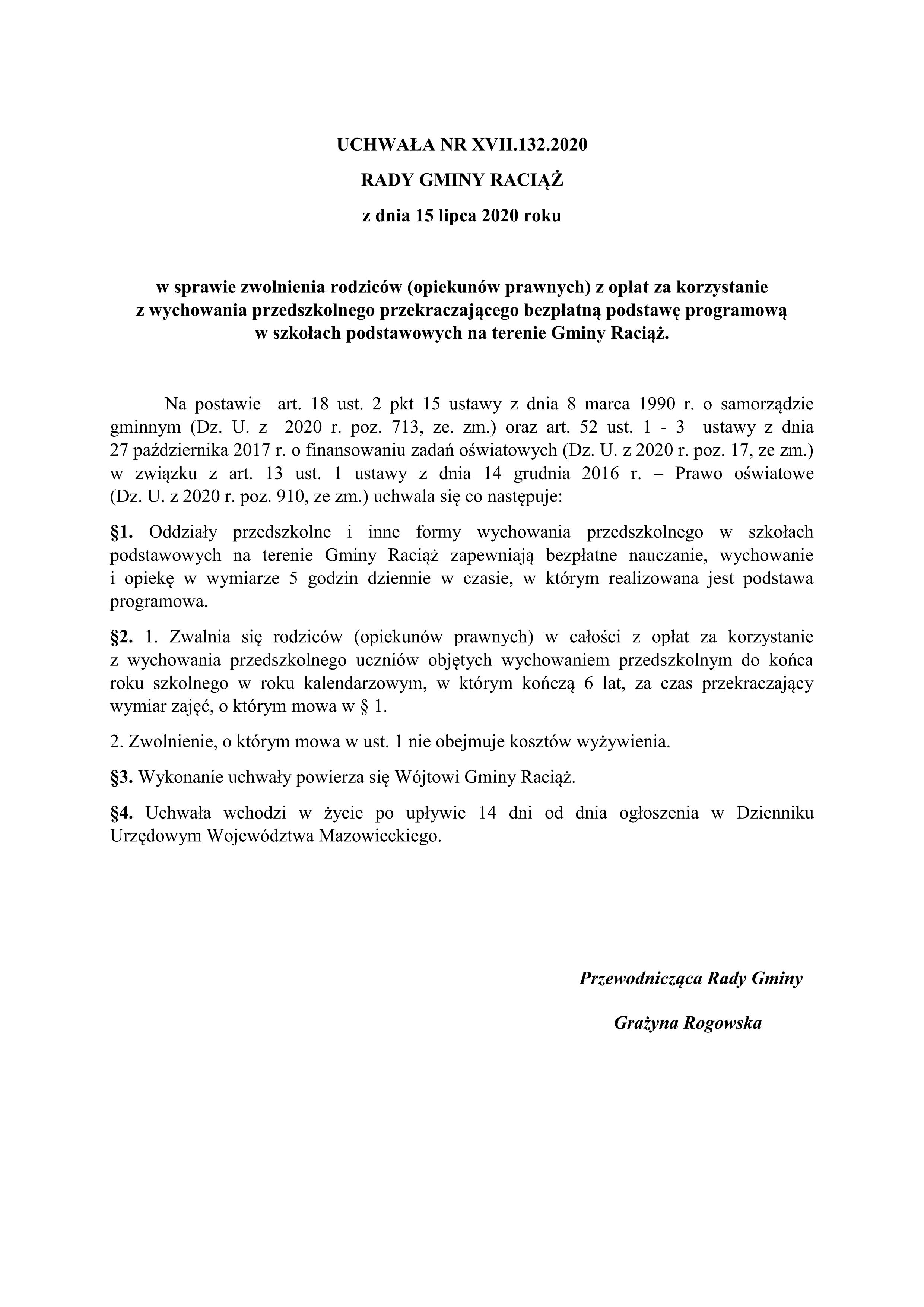 UCHWAŁA NR XVII.132.2020 RADY GMINY RACIĄŻ z dnia 15 lipca 2020 roku