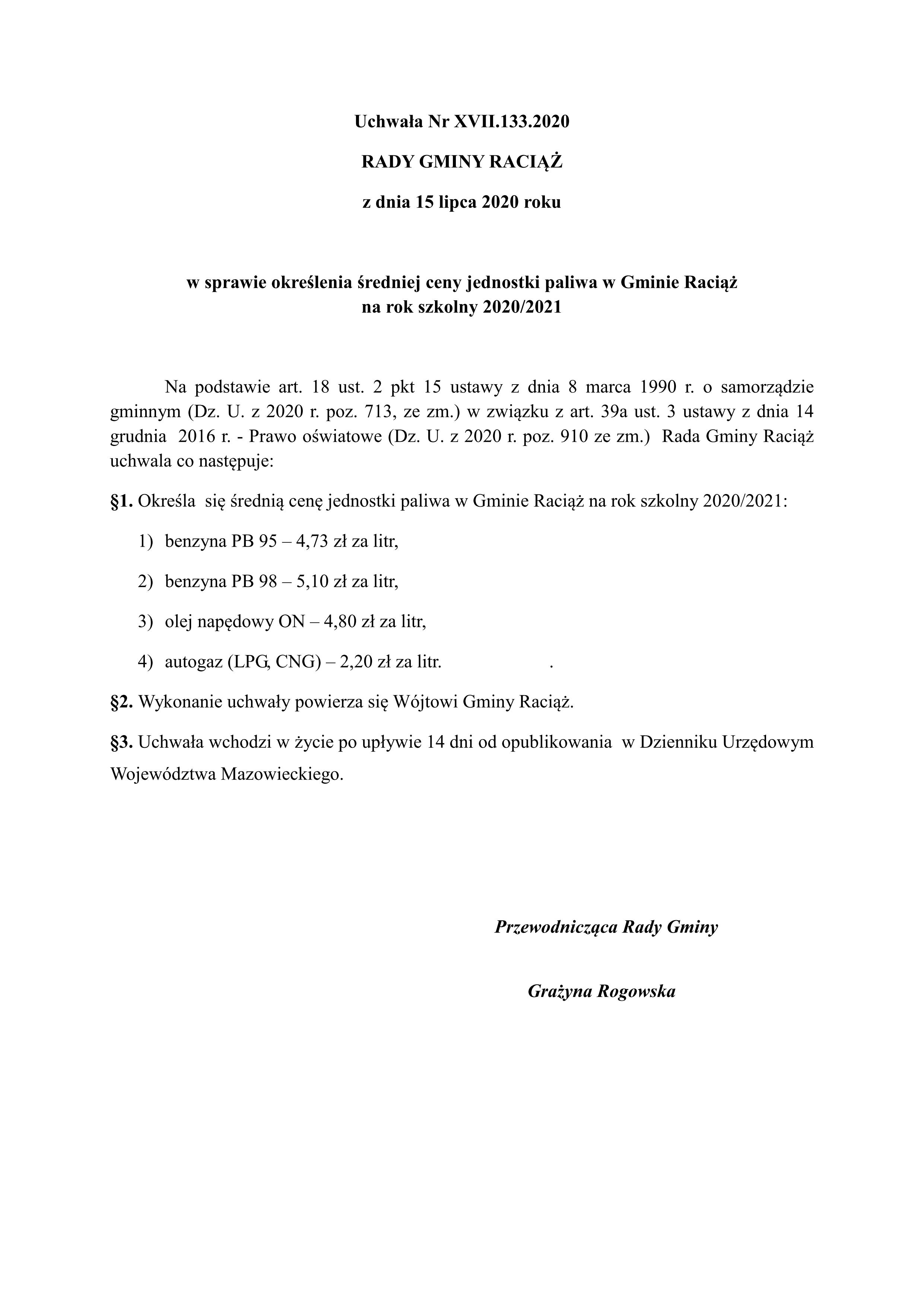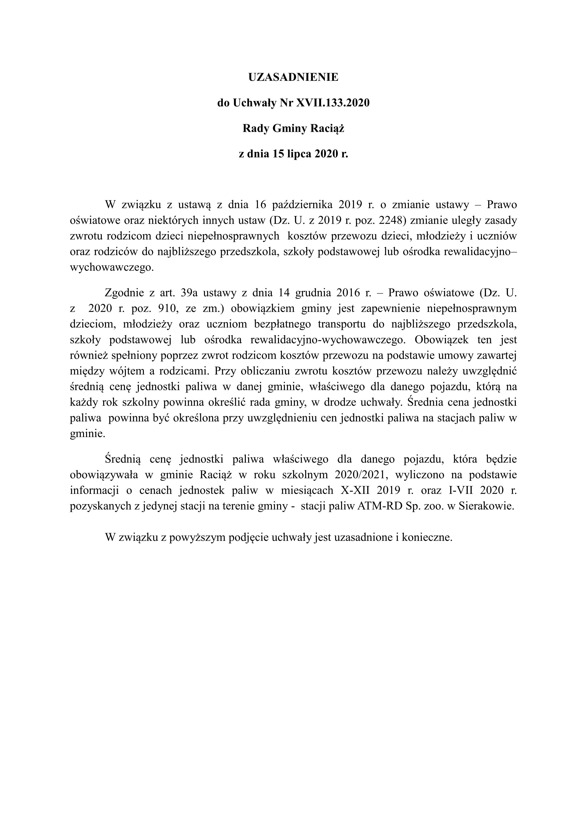 Uchwała Nr XVII.133.2020 RADY GMINY RACIĄŻ z dnia 15 lipca 2020 roku
