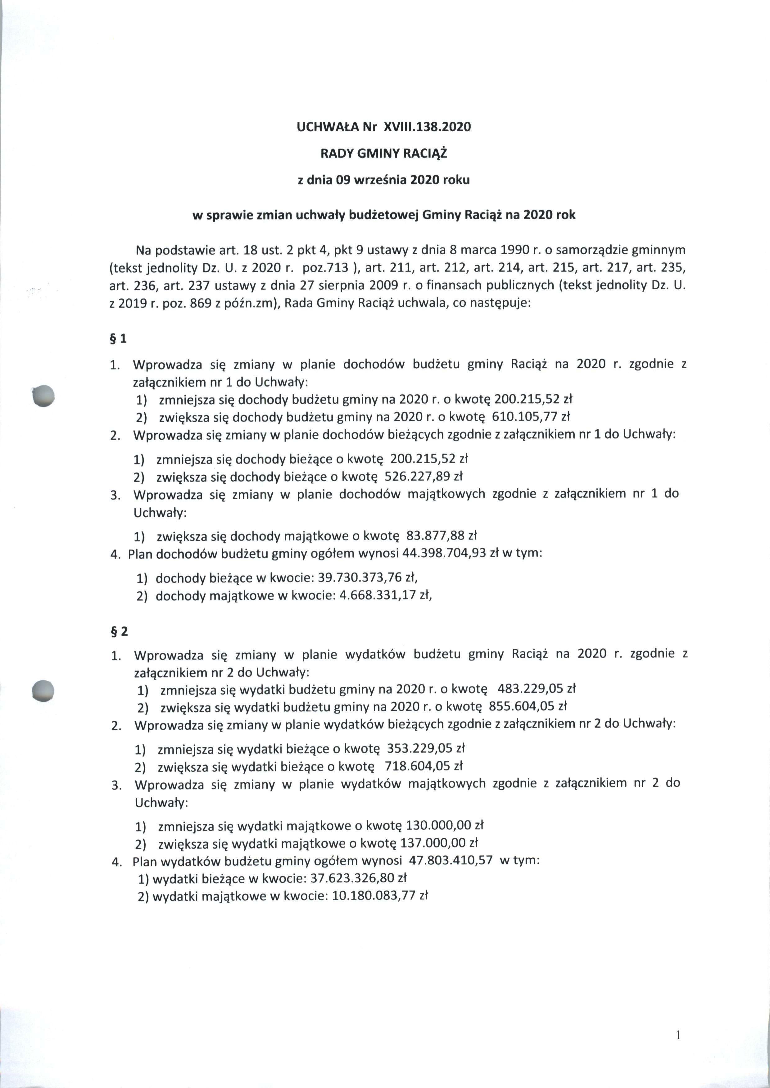 UCHWAŁA Nr XVIII.138.2020 RADY GMINY RACIĄŻ z dnia 9 września 2020 roku