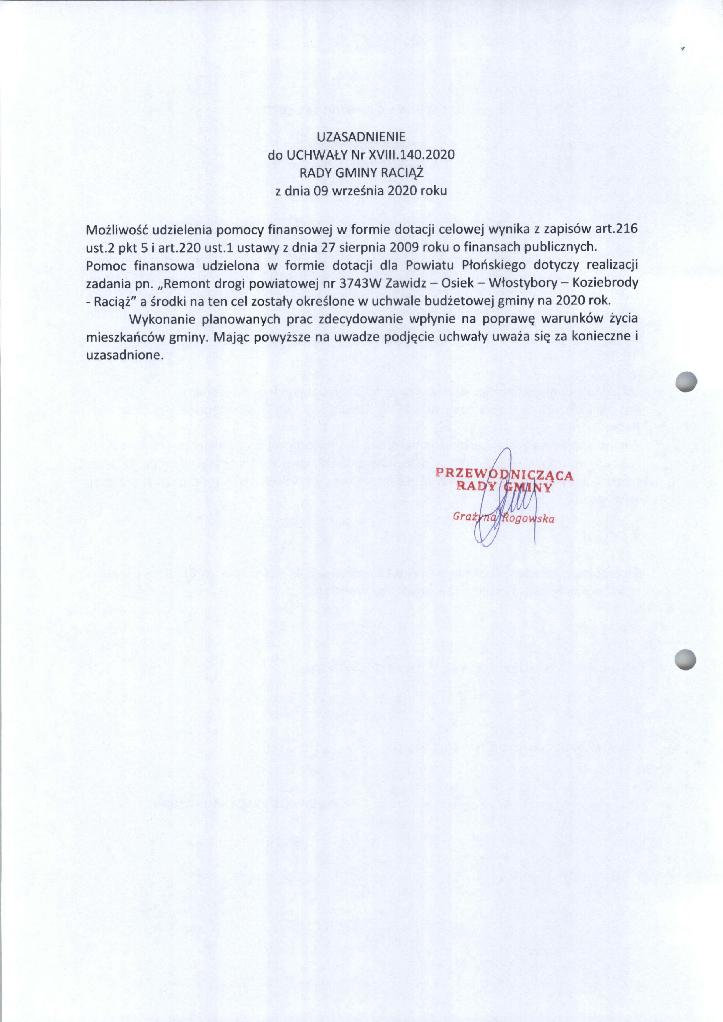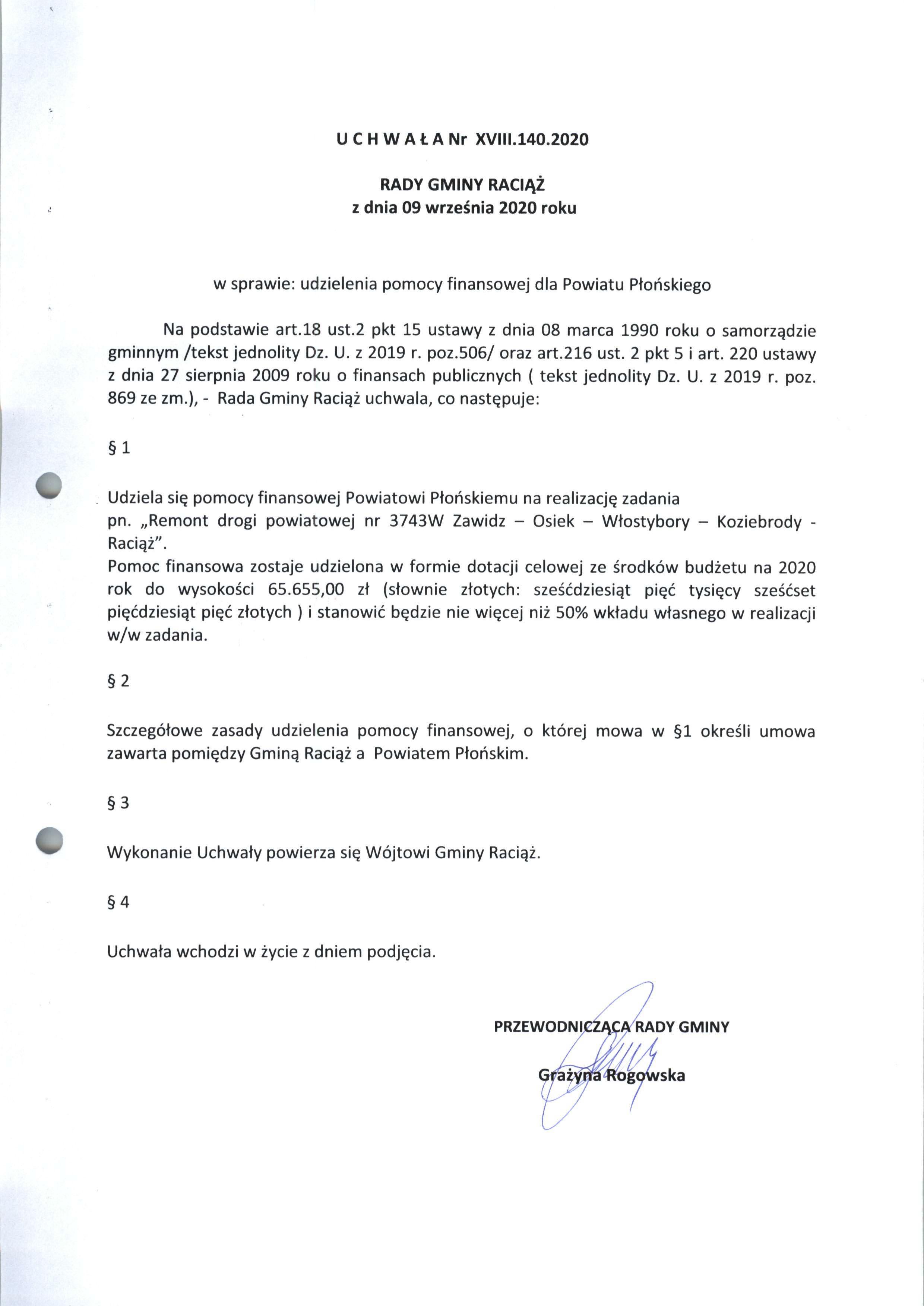 UCHWAŁA Nr XVIII.140.2020 RADY GMINY RACIĄŻ z dnia 9 września 2020 roku