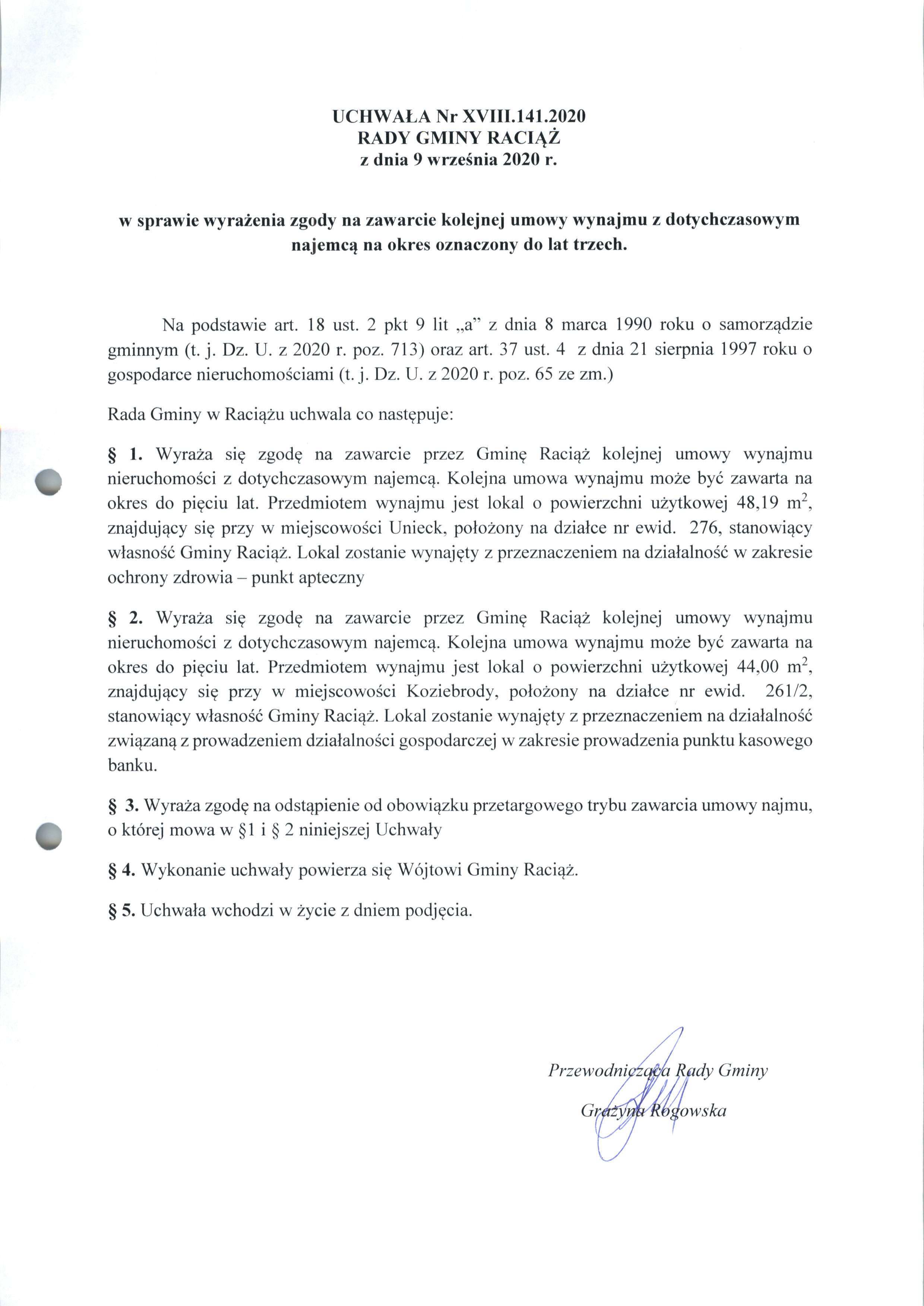 UCHWAŁA Nr XVIII.141.2020 RADY GMINY RACIĄŻ z dnia 9 września 2020 roku