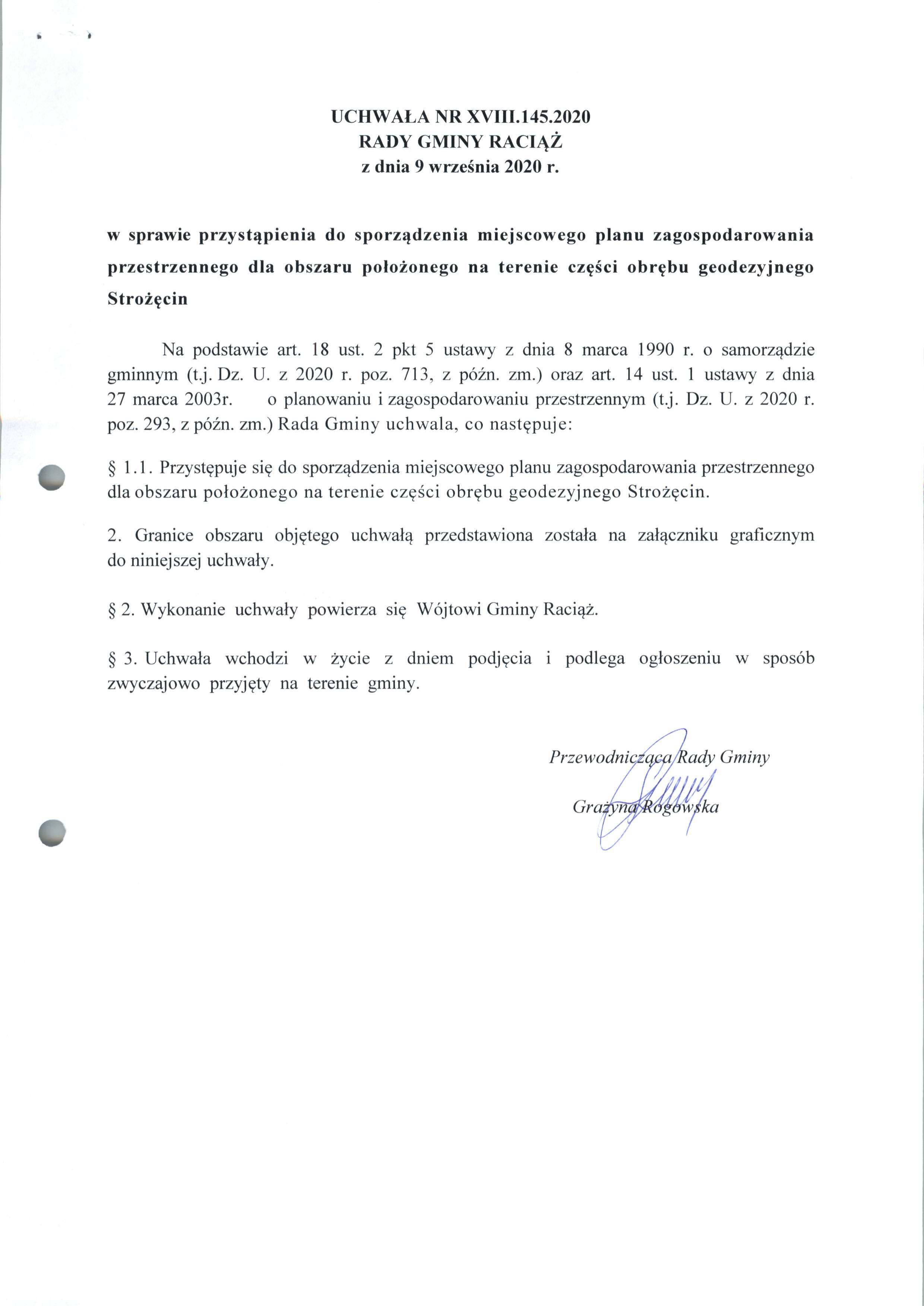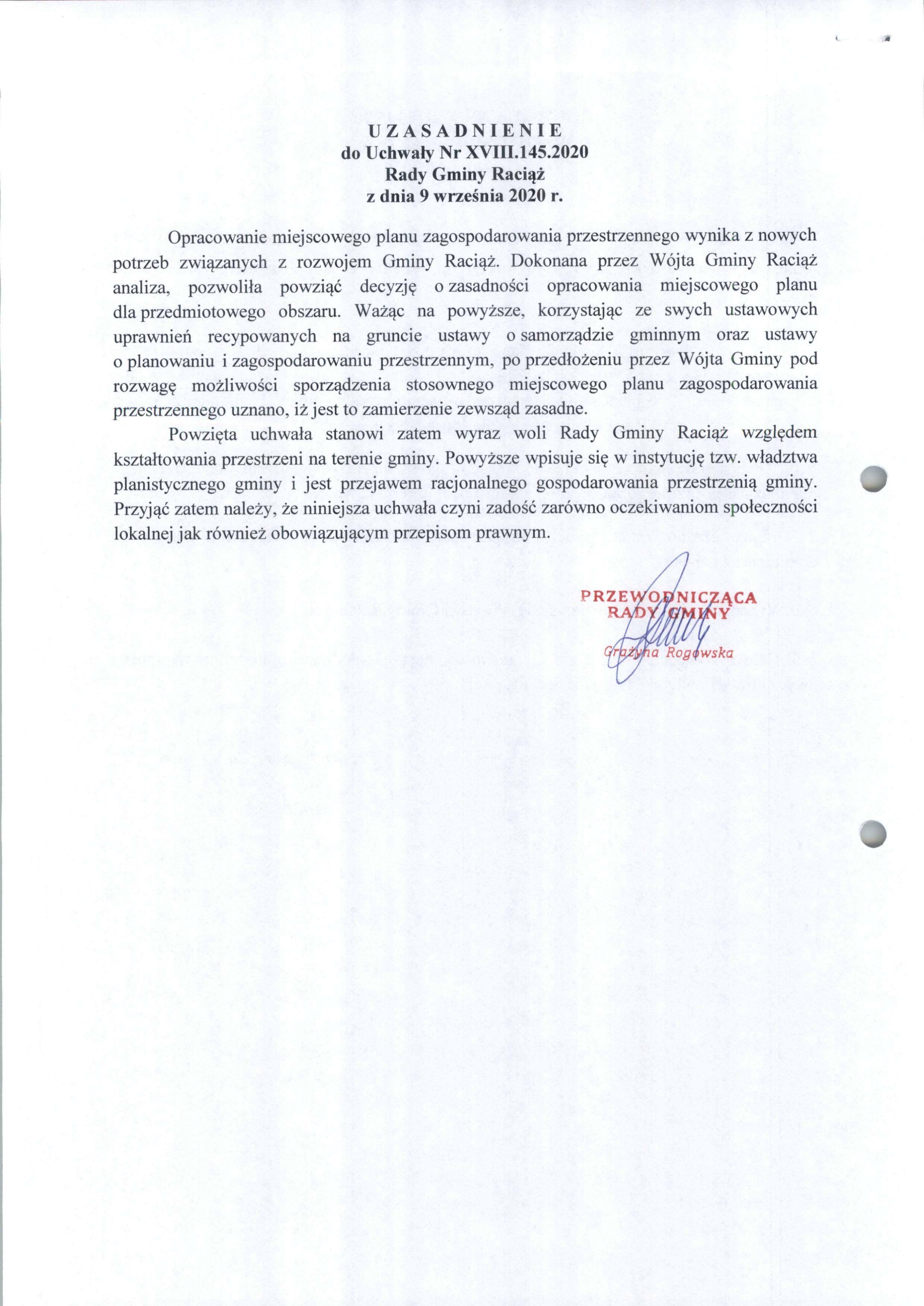 UCHWAŁA Nr XVIII.145.2020 RADY GMINY RACIĄŻ z dnia 9 września 2020 roku