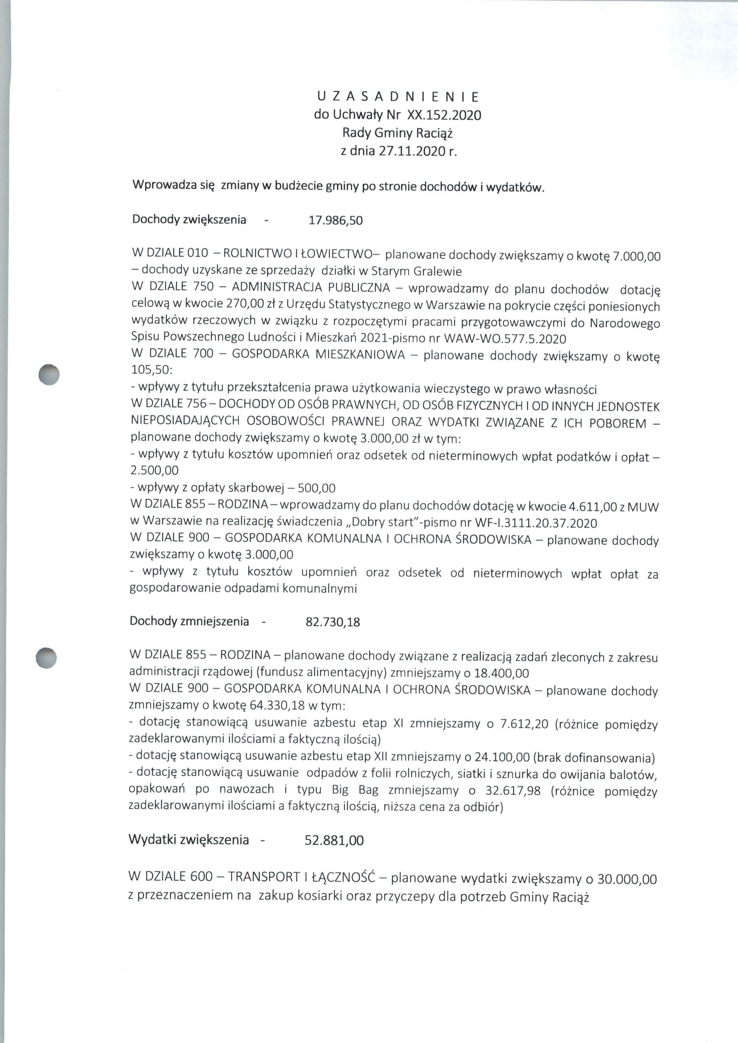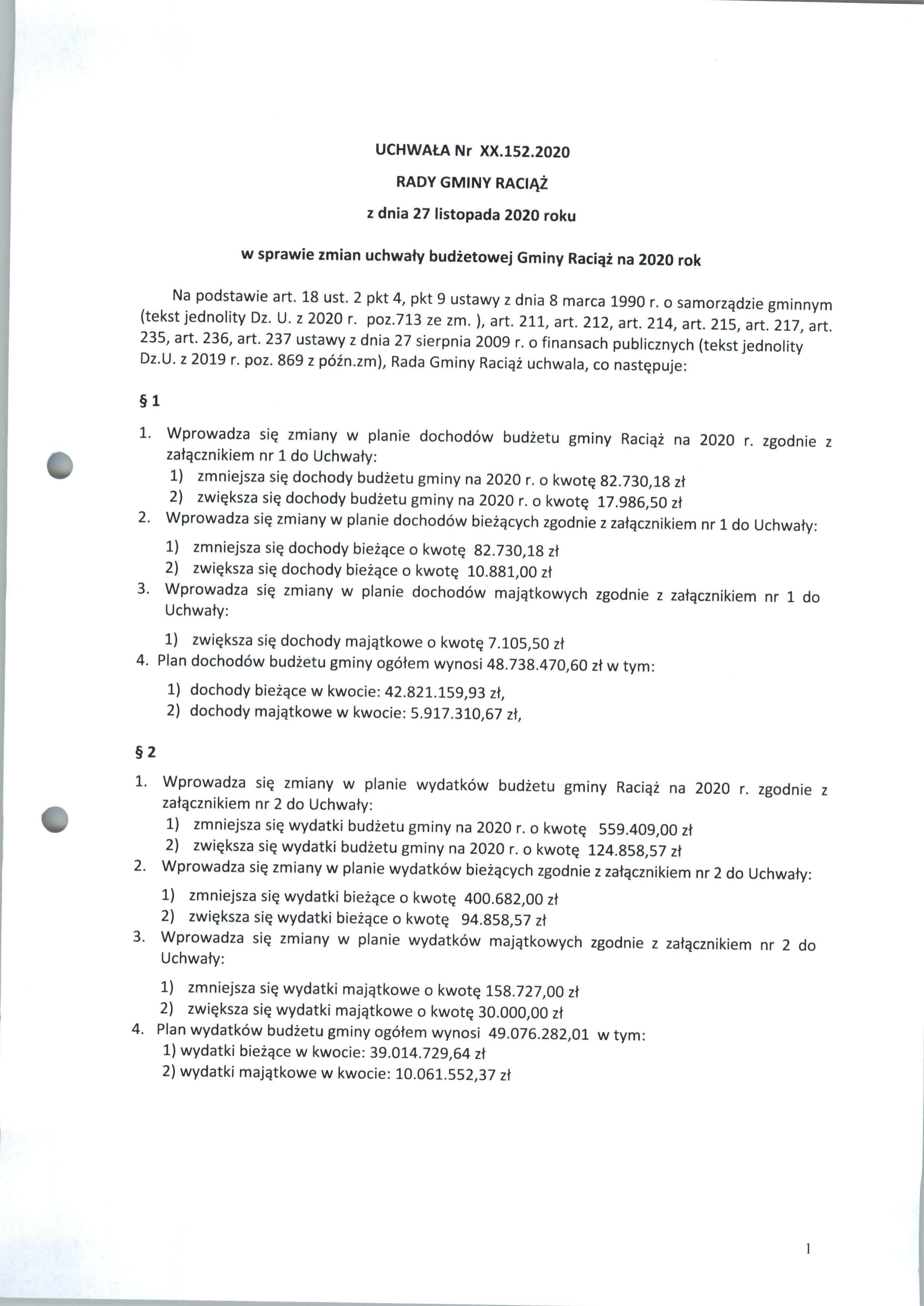 UCHWAŁA Nr XX.152.2020 RADY GMINY RACIĄŻ z dnia 27 listopada 2020 roku