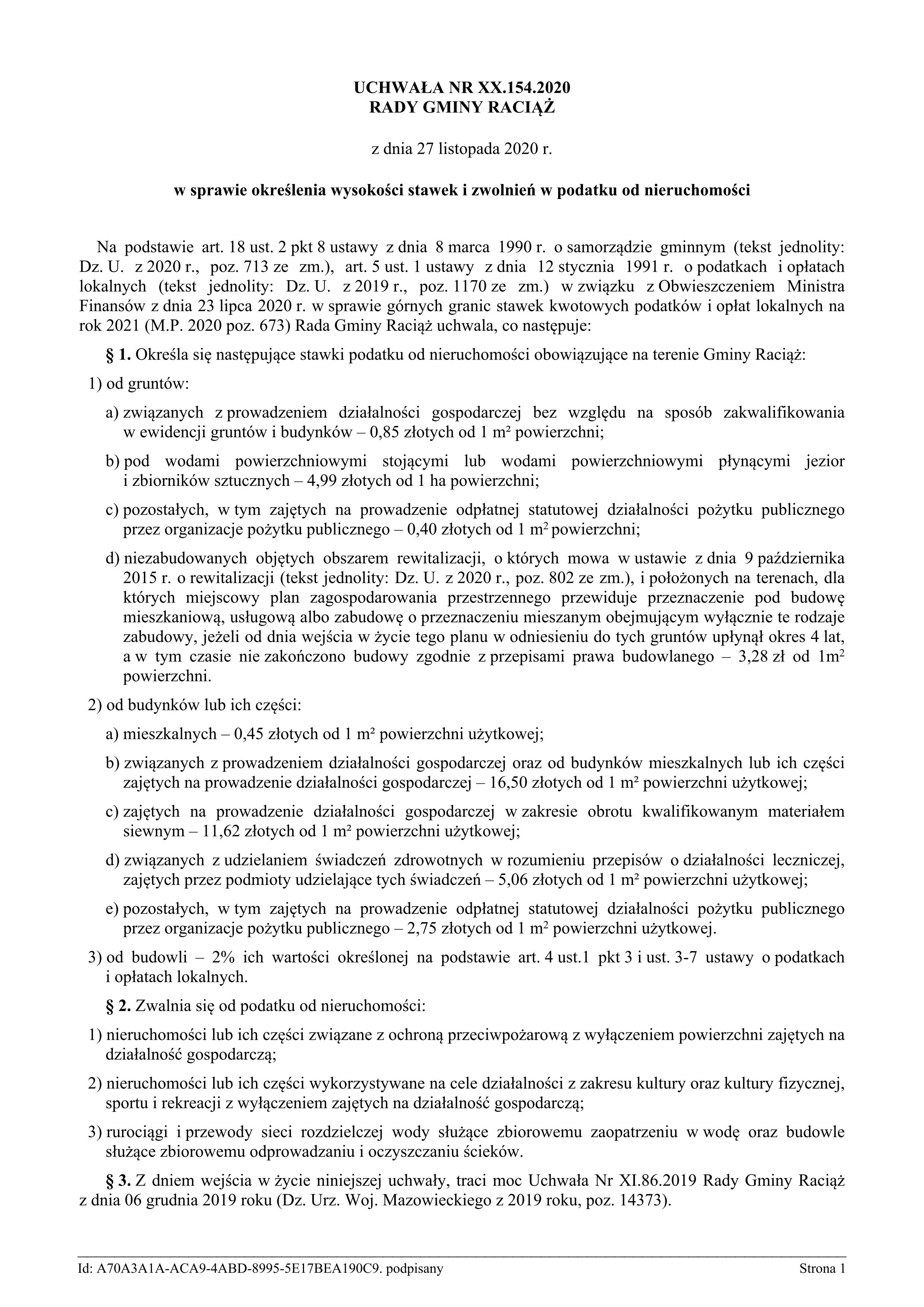 UCHWAŁA Nr XX.154.2020 RADY GMINY RACIĄŻ z dnia 27 listopada 2020 roku