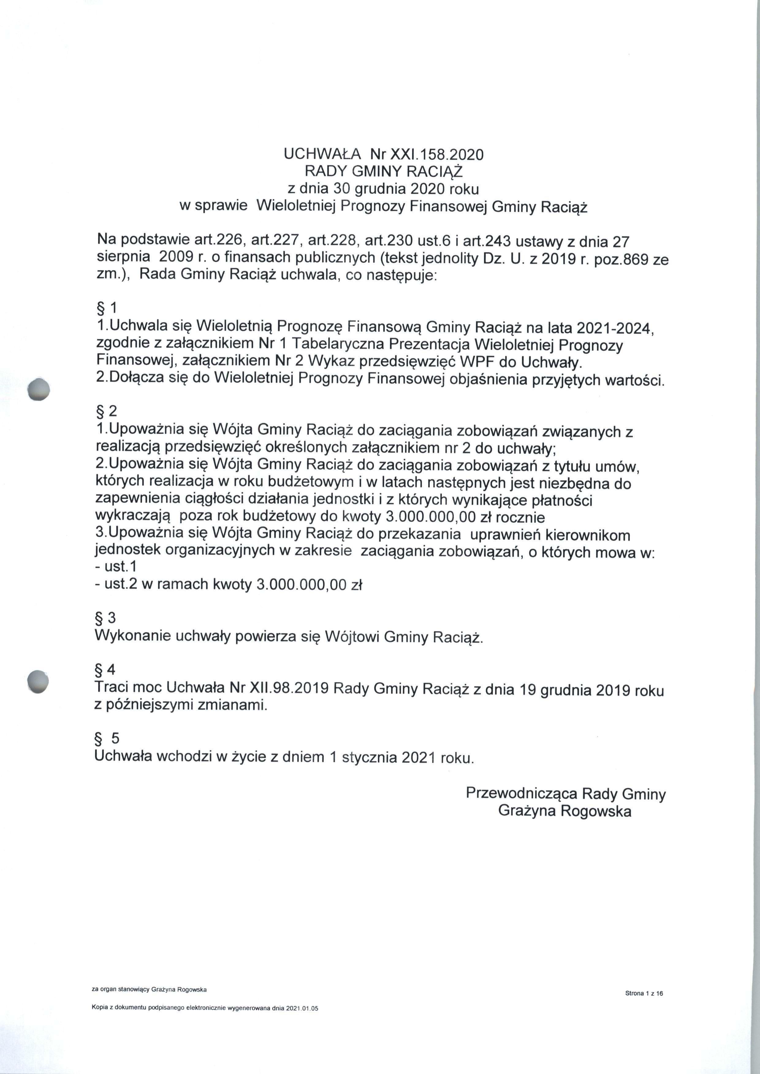 UCHWAŁA Nr XXI.158.2020 RADY GMINY RACIĄŻ z dnia 30 grudnia 2020 roku