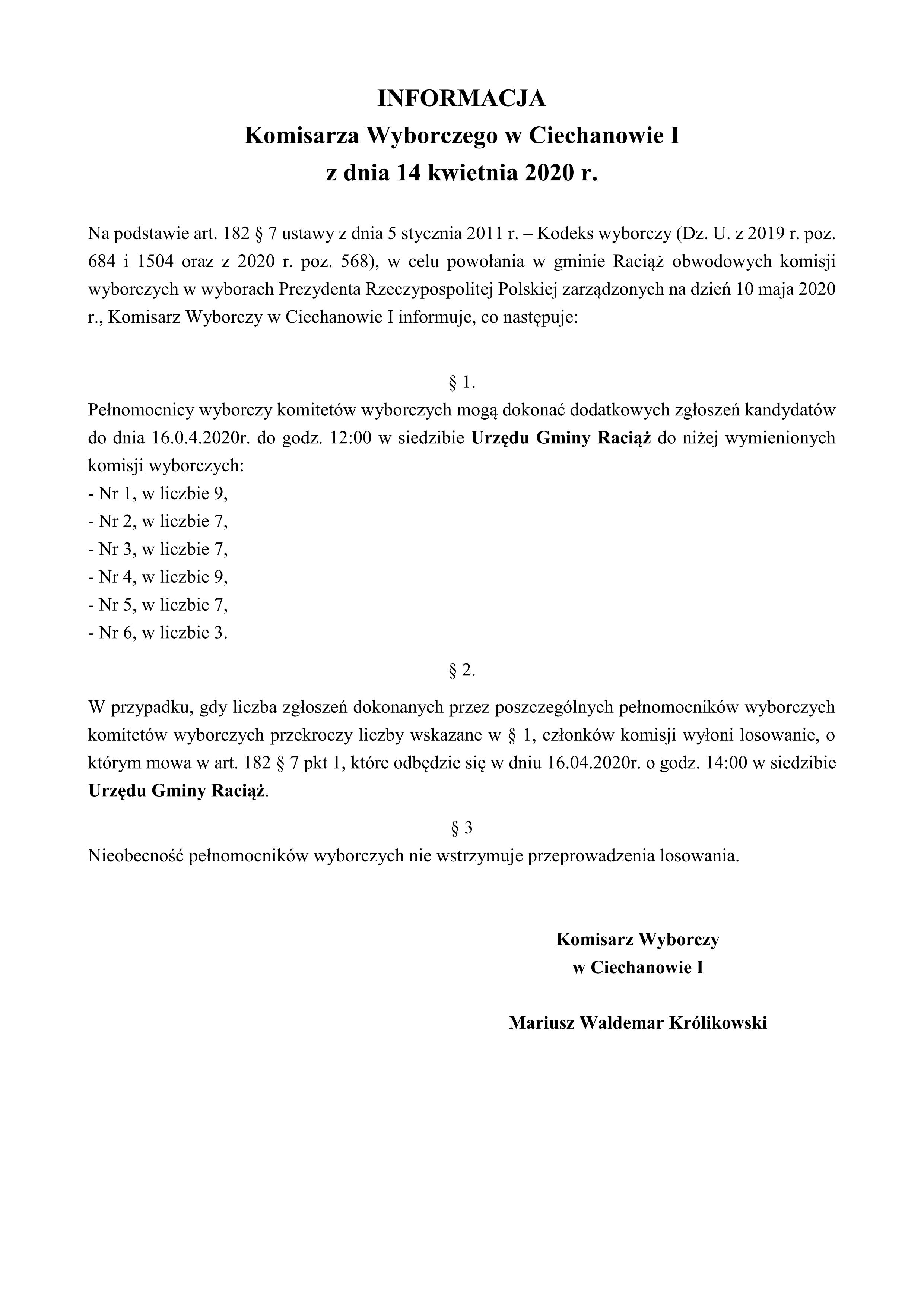 INFORMACJA Komisarza Wyborczego w Ciechanowie I z dnia 14 kwietnia 2020 r.