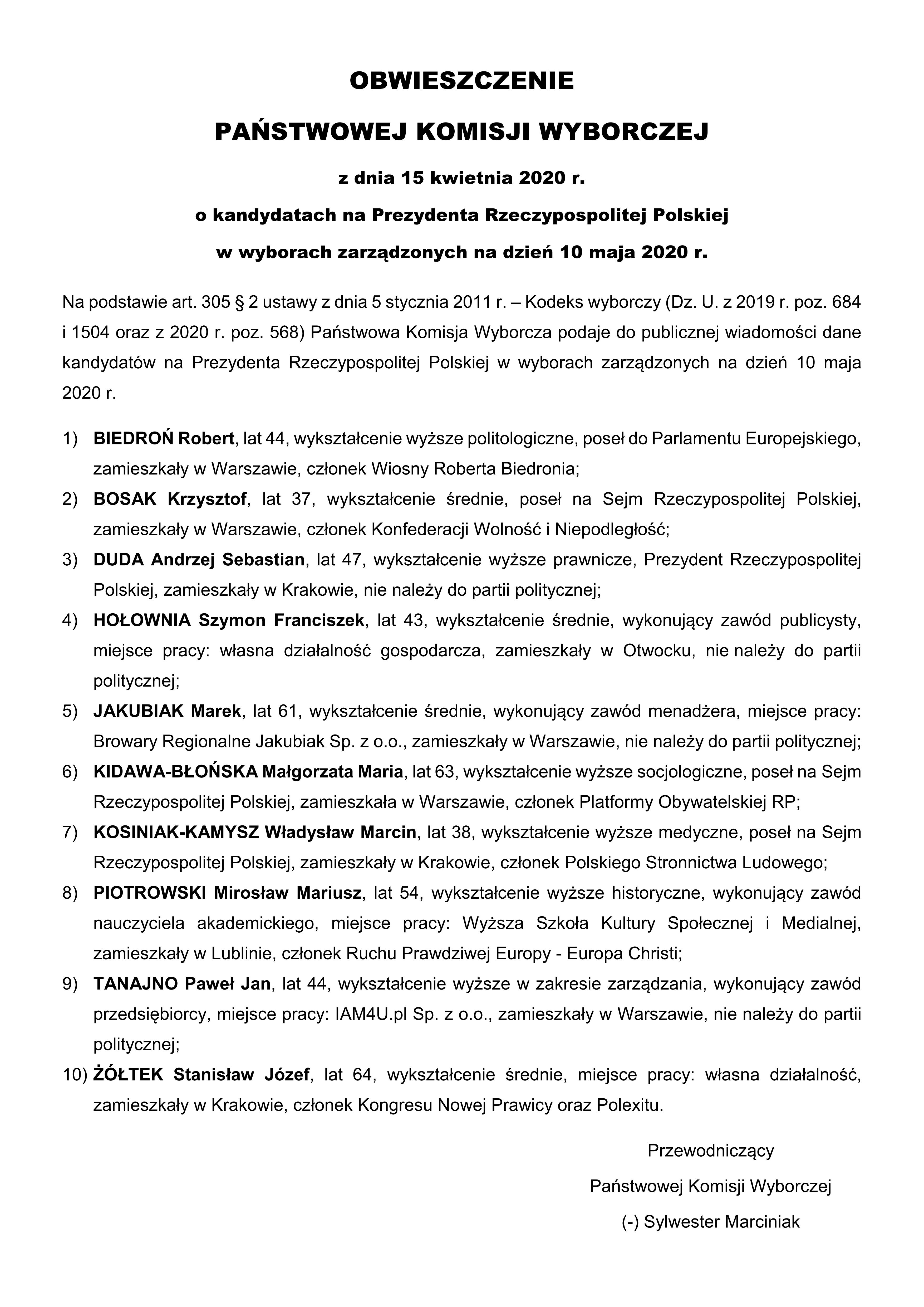 Obwieszczenie Państwowej Komisji Wyborczej z dnia 15 kwietnia 2020 r. o kandydatach na Prezydenta Rzeczypospolitej Polskiej w wyborach zarządzonych na dzień 10 maja 2020 r.