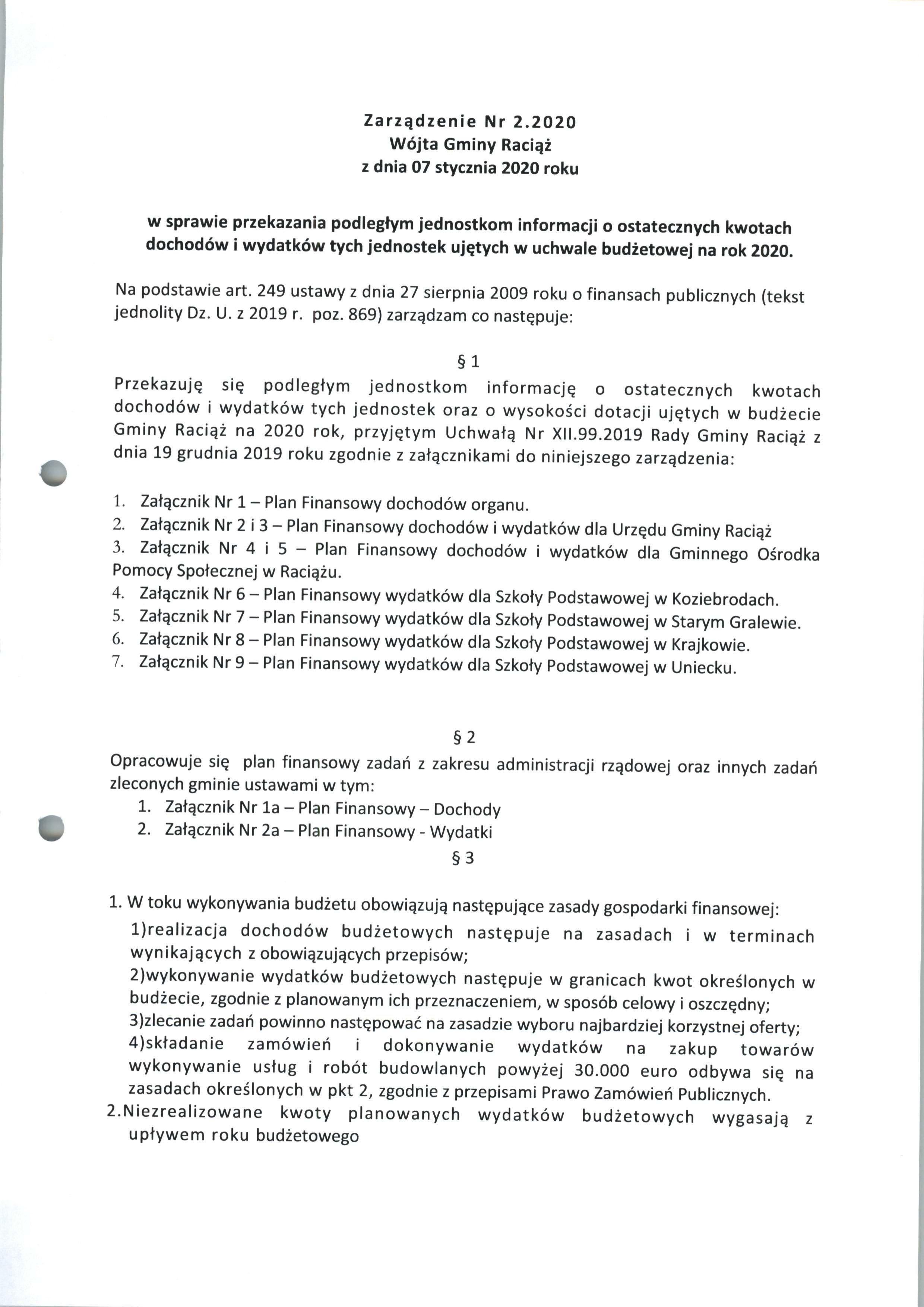 Zarządzenie Nr 2.2020 Wójta Gminy Raciąż z dnia 7 stycznia 2020 roku - Zarządzenia Wójta Gminy 2020 rok - Bip Gmina Raciąż