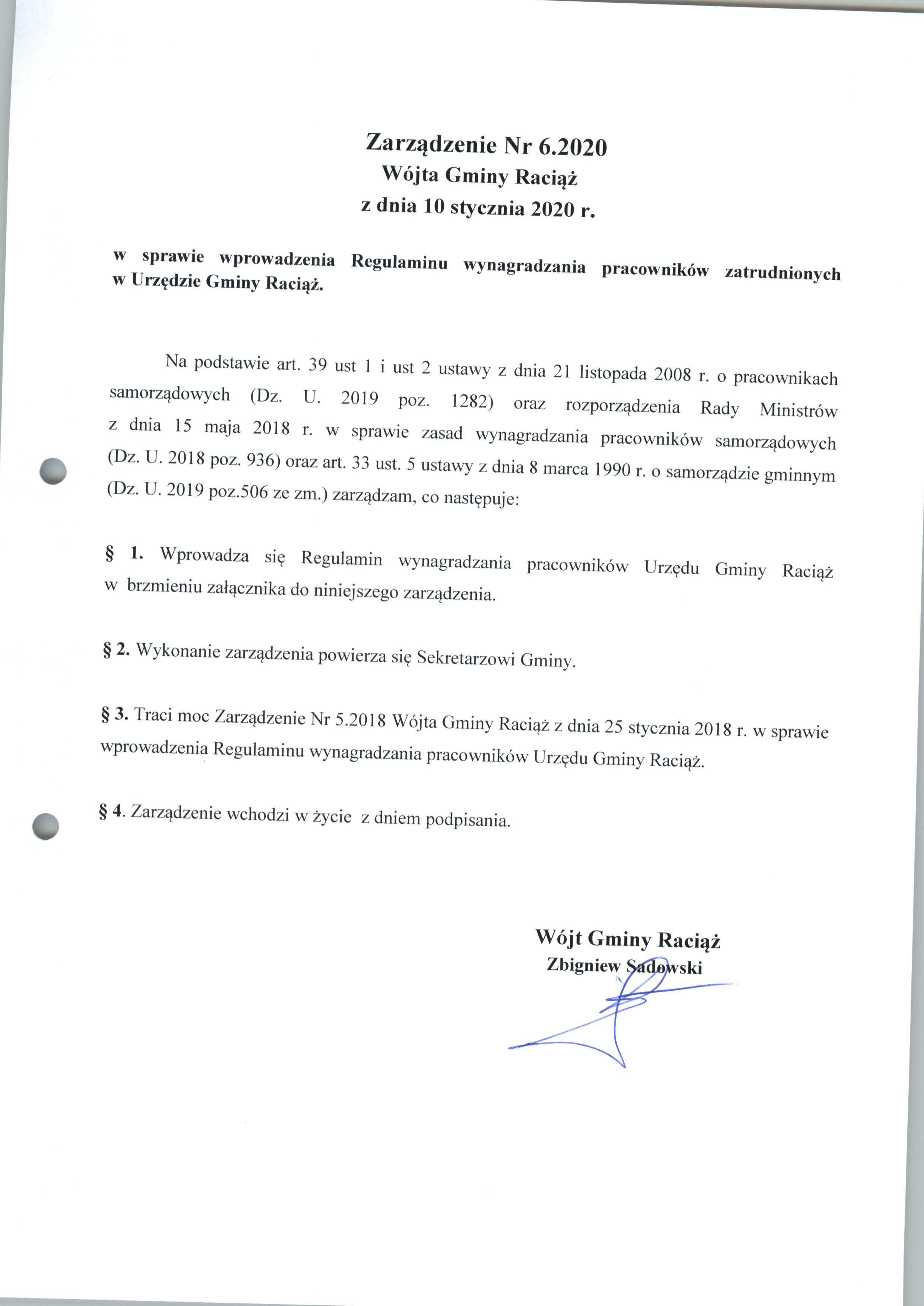 Zarządzenie Nr 6.2020 Wójta Gminy Raciąż z dnia 10 stycznia 2020 roku - Zarządzenia Wójta Gminy 2020 rok - Bip Gmina Raciąż