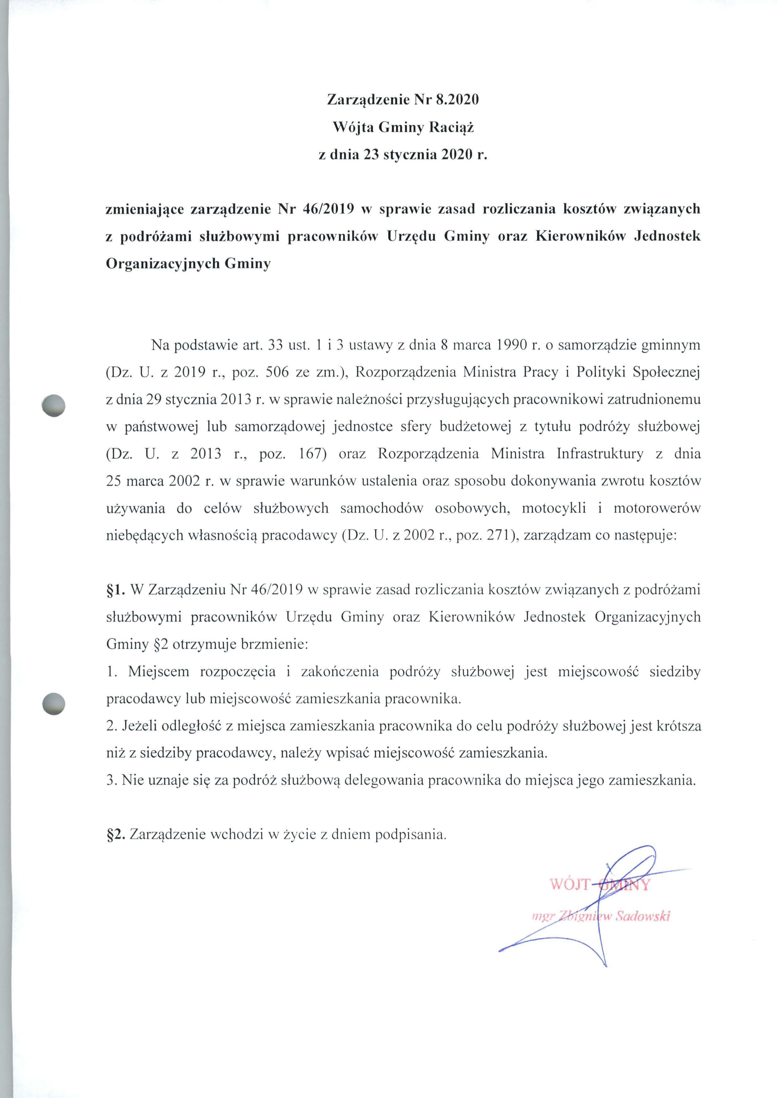 Zarządzenie Nr 8.2020 Wójta Gminy Raciąż z dnia 23 stycznia 2020 roku