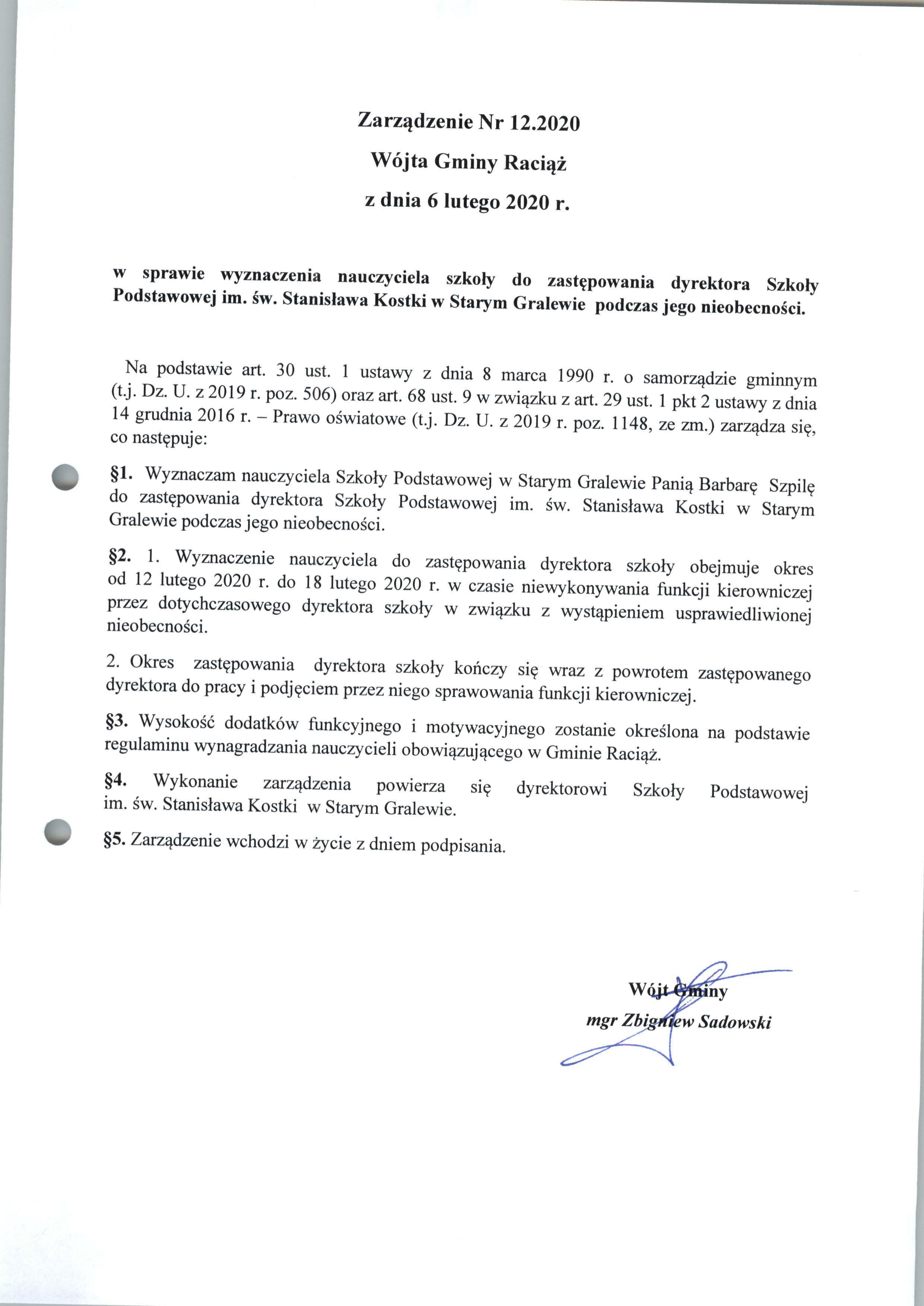 Zarządzenie Nr 12.2020 Wójta Gminy Raciąż z dnia 6 lutego 2020 roku