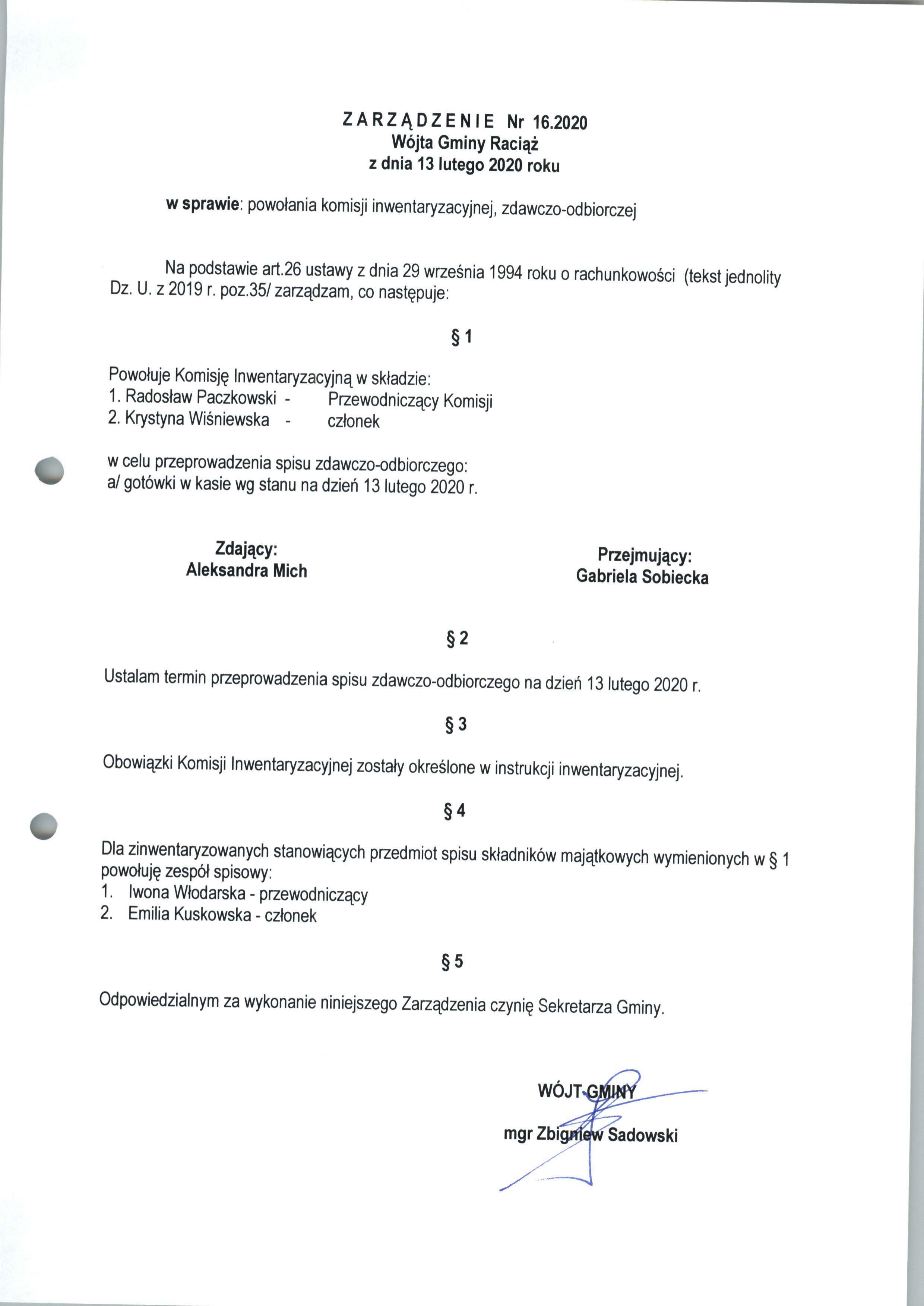 Zarządzenie Nr 16.2020 Wójta Gminy Raciąż z dnia 13 lutego 2020 roku