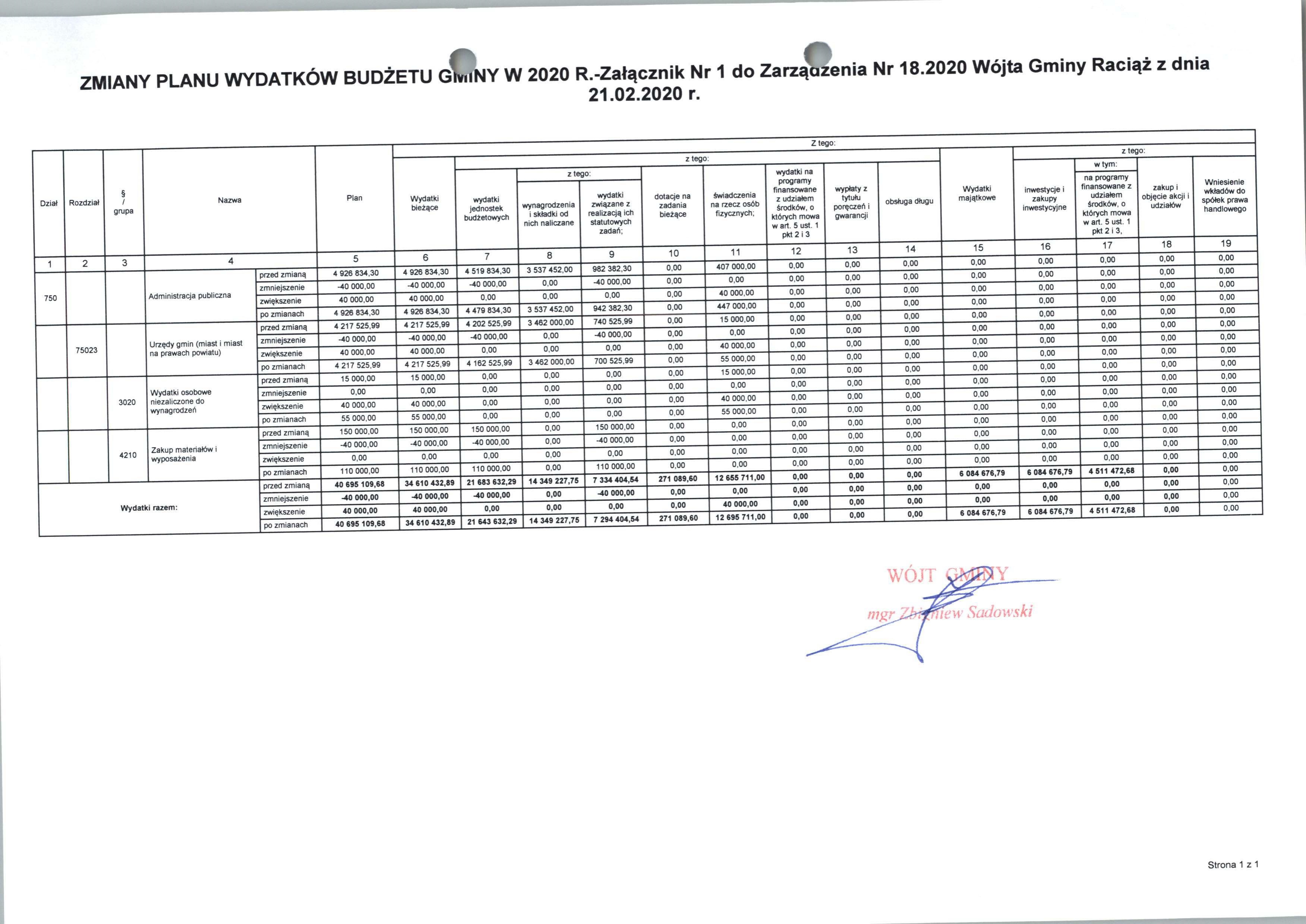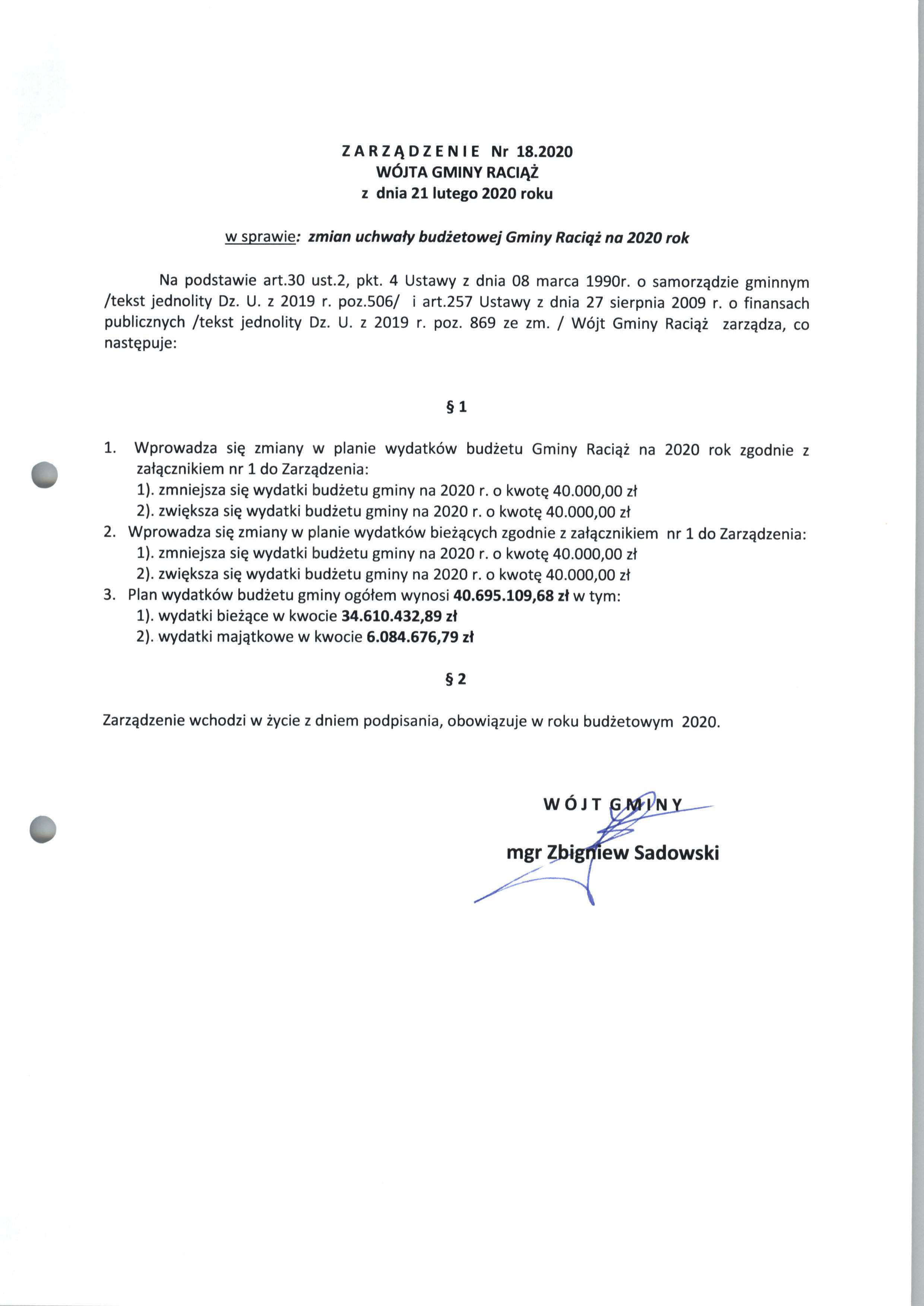 Zarządzenie Nr 18.2020 Wójta Gminy Raciąż z dnia 21 lutego 2020 roku
