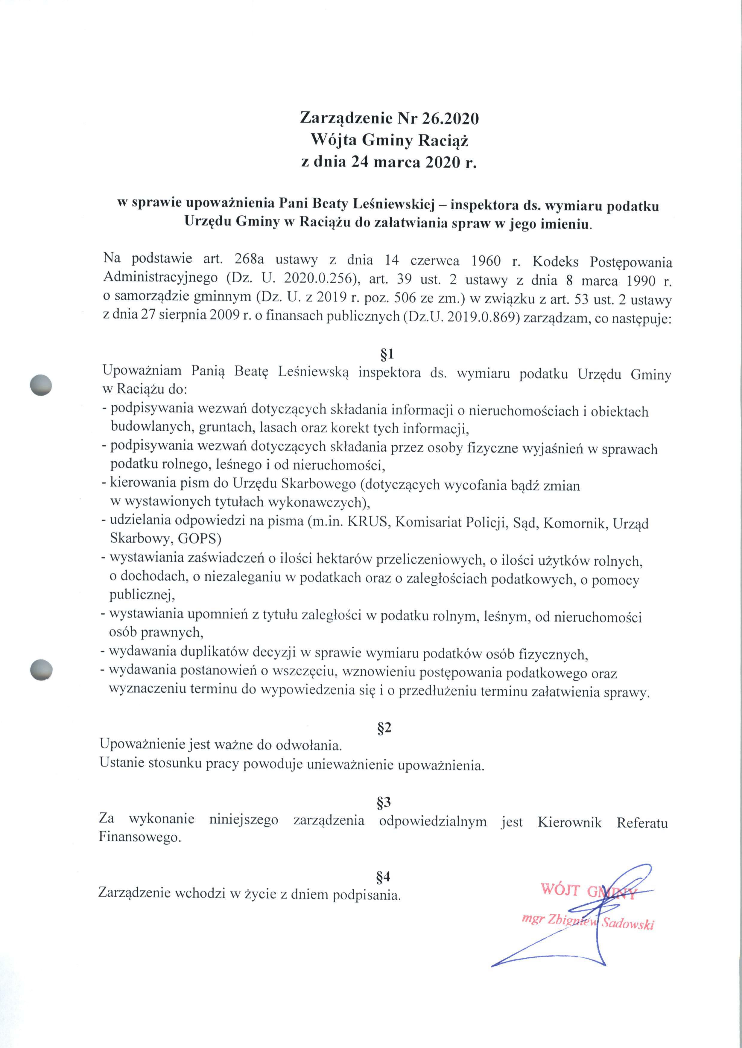 Zarządzenie Nr 26.2020 Wójta Gminy Raciąż z dnia 24 marca 2020 roku