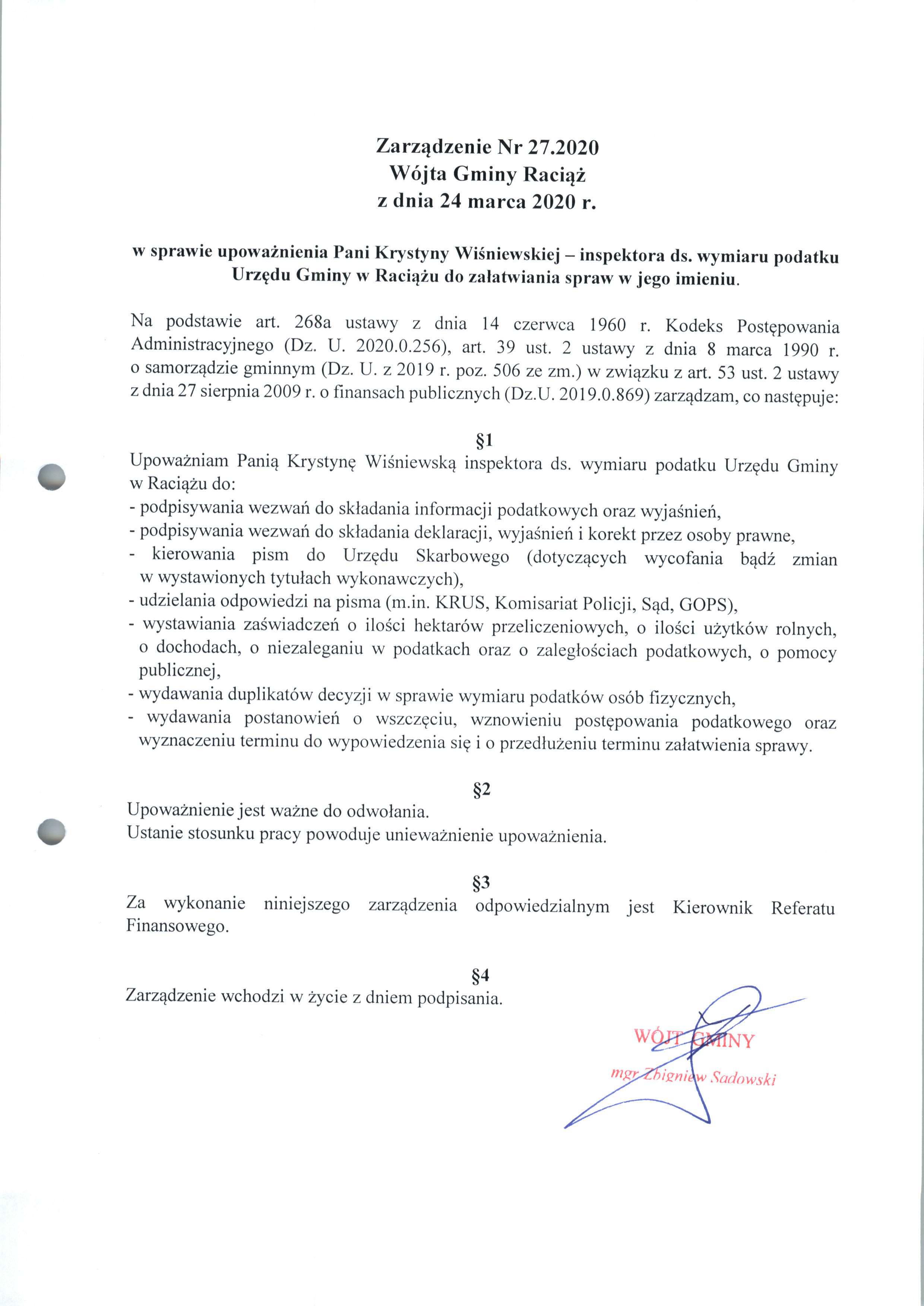 Zarządzenie Nr 27.2020 Wójta Gminy Raciąż z dnia 24 marca 2020 roku