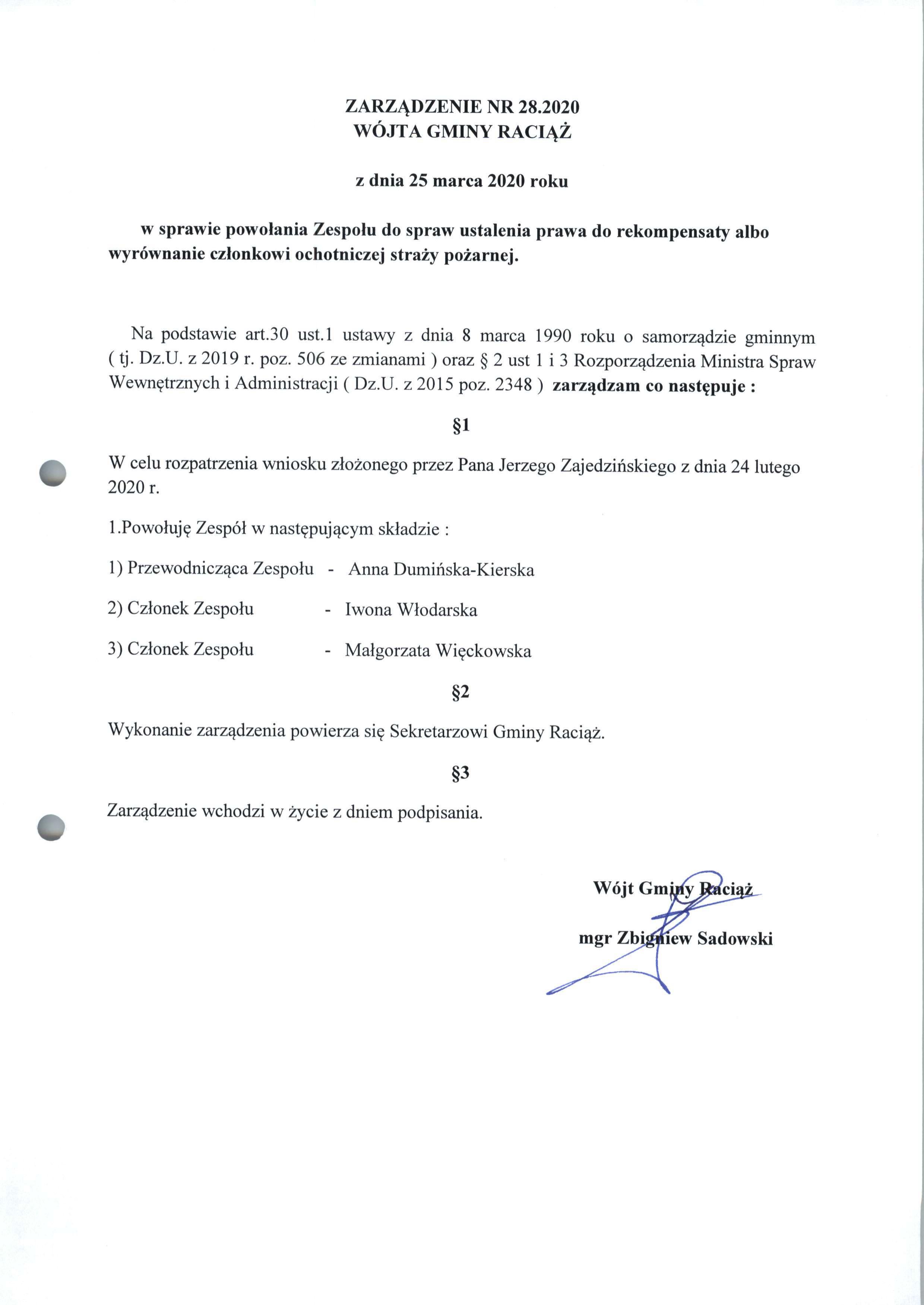 Zarządzenie Nr 28.2020 Wójta Gminy Raciąż z dnia 25 marca 2020 roku
