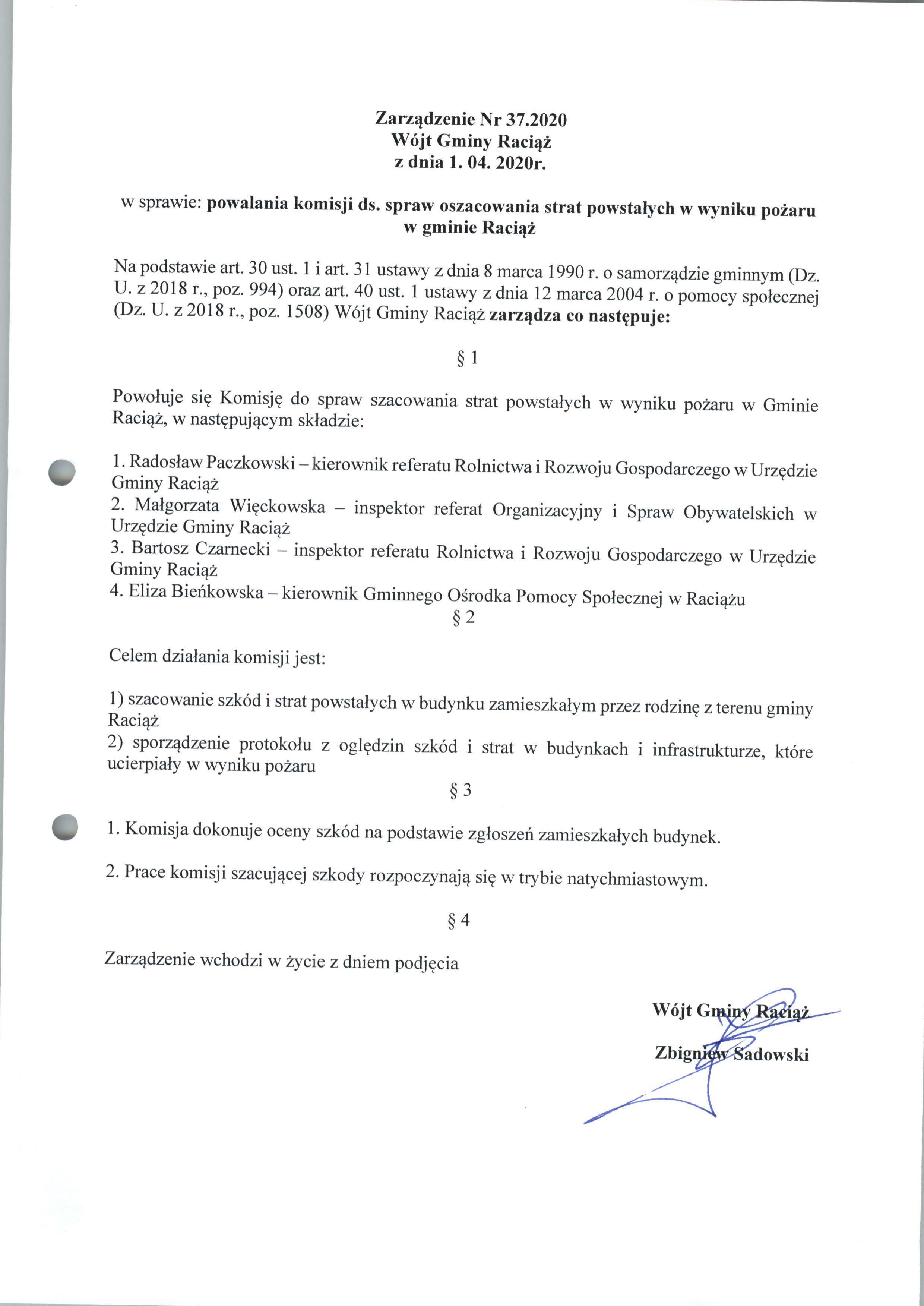 Zarządzenie Nr 37.2020 Wójta Gminy Raciąż z dnia 1 kwietnia 2020 roku