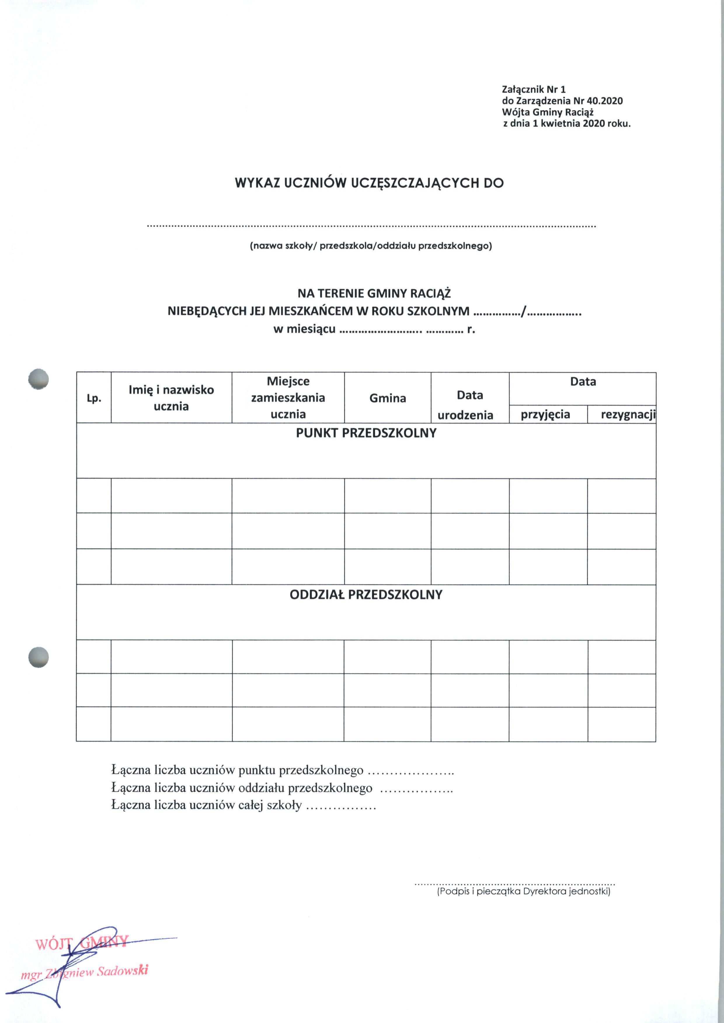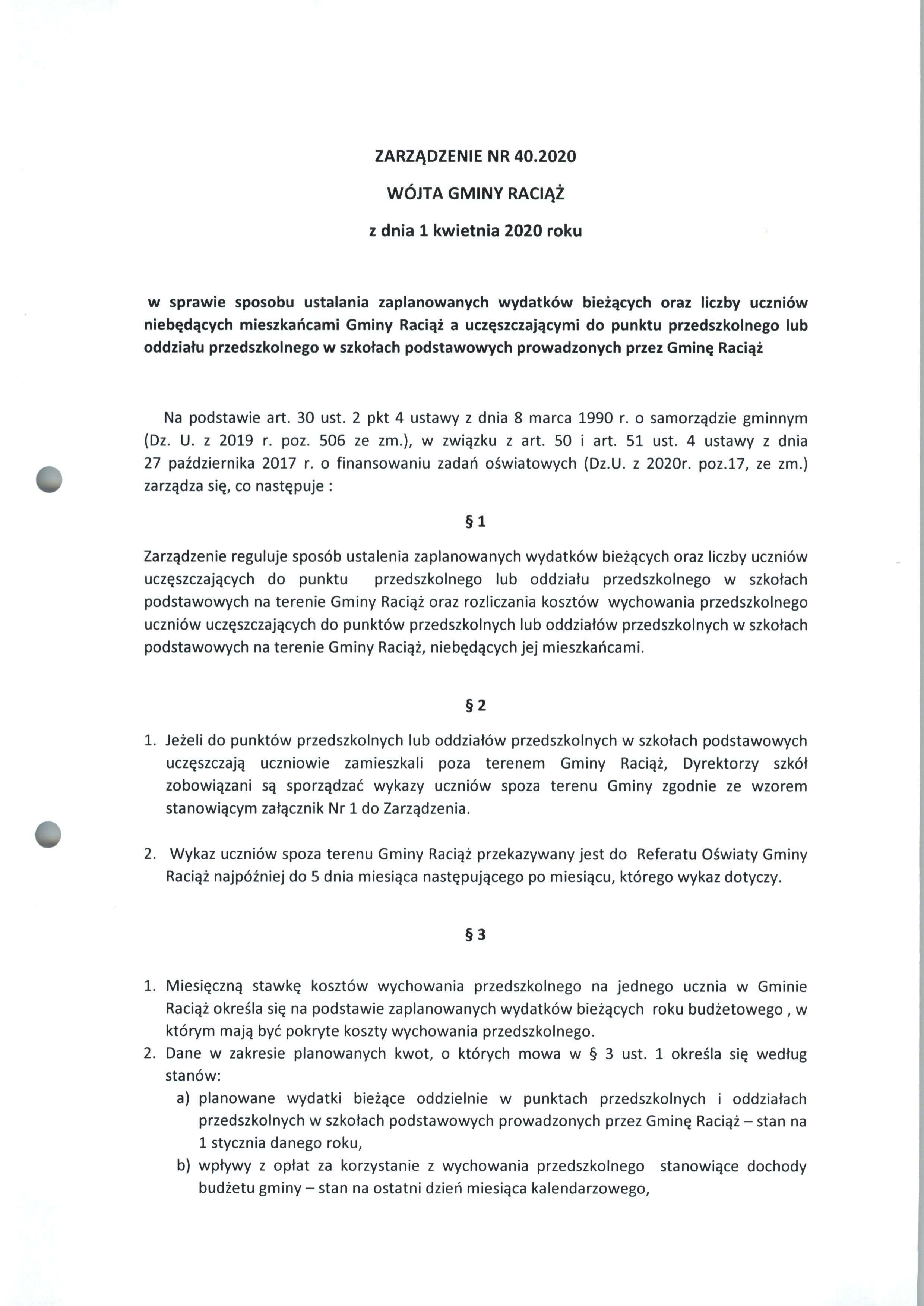 Zarządzenie Nr 40.2020 Wójta Gminy Raciąż z dnia 1 kwietnia 2020 roku