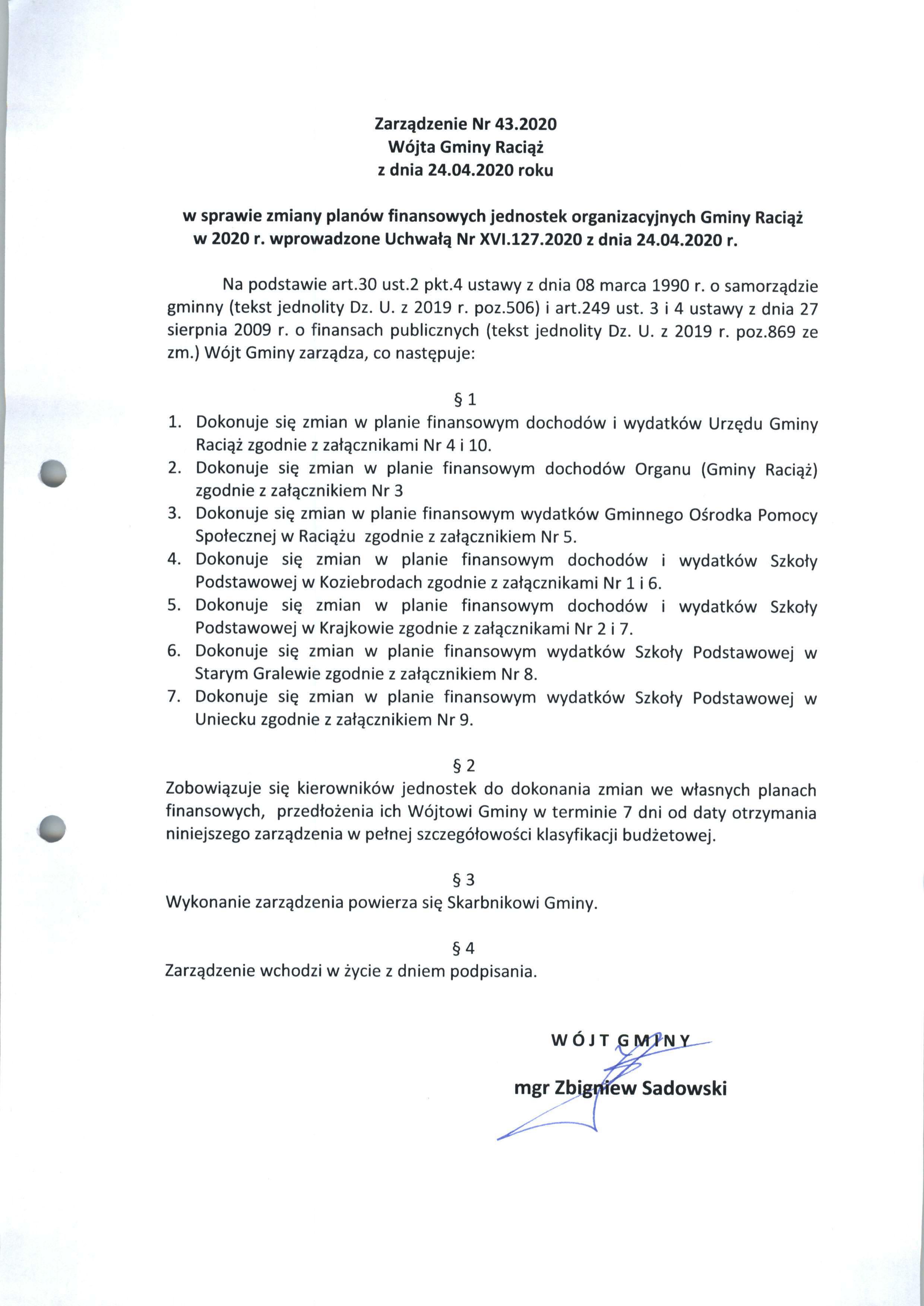 Zarządzenie Nr 43.2020 Wójta Gminy Raciąż z dnia 24 kwietnia 2020 roku