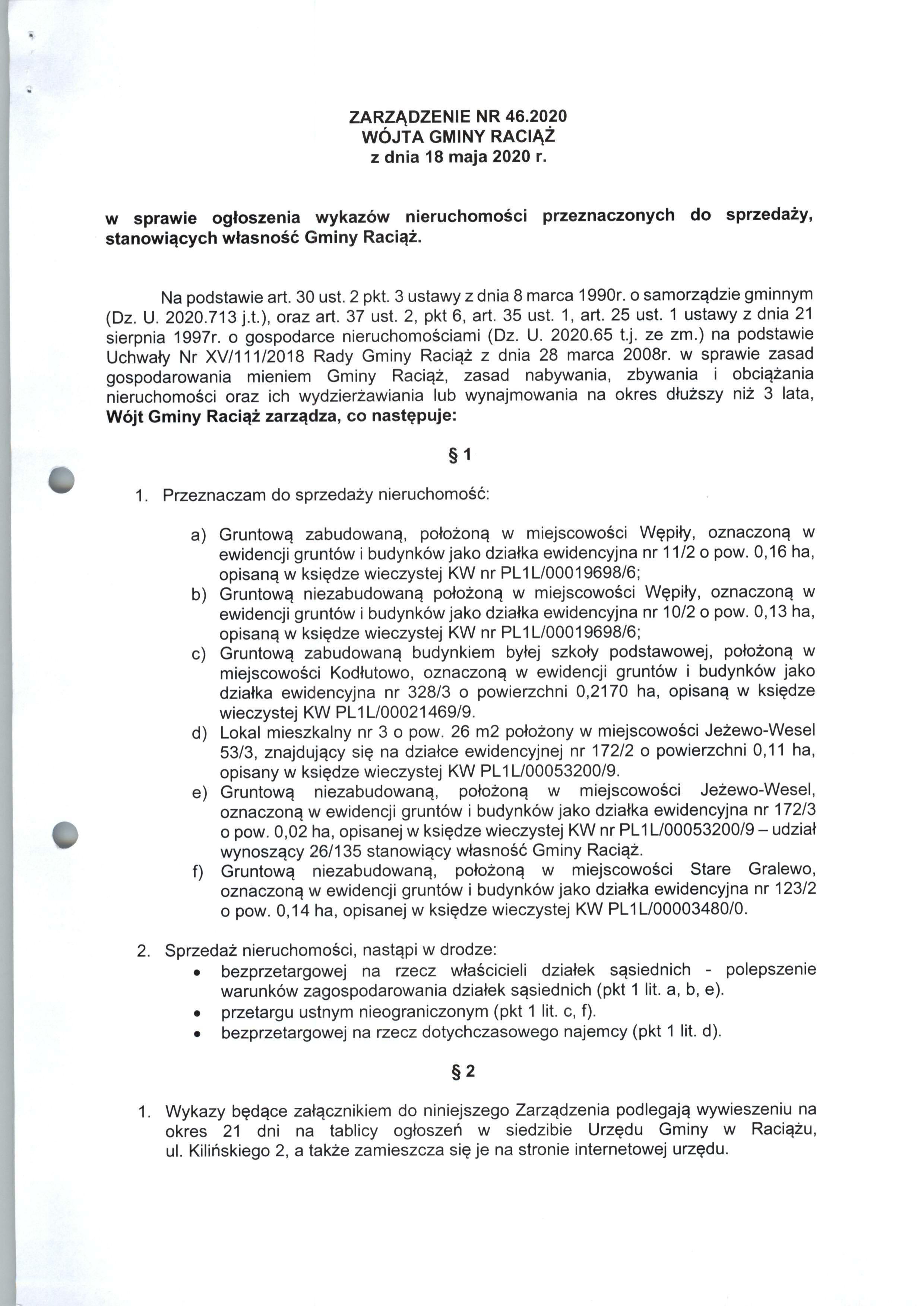 Zarządzenie Nr 46.2020 Wójta Gminy Raciąż z dnia 18 maja 2020 roku