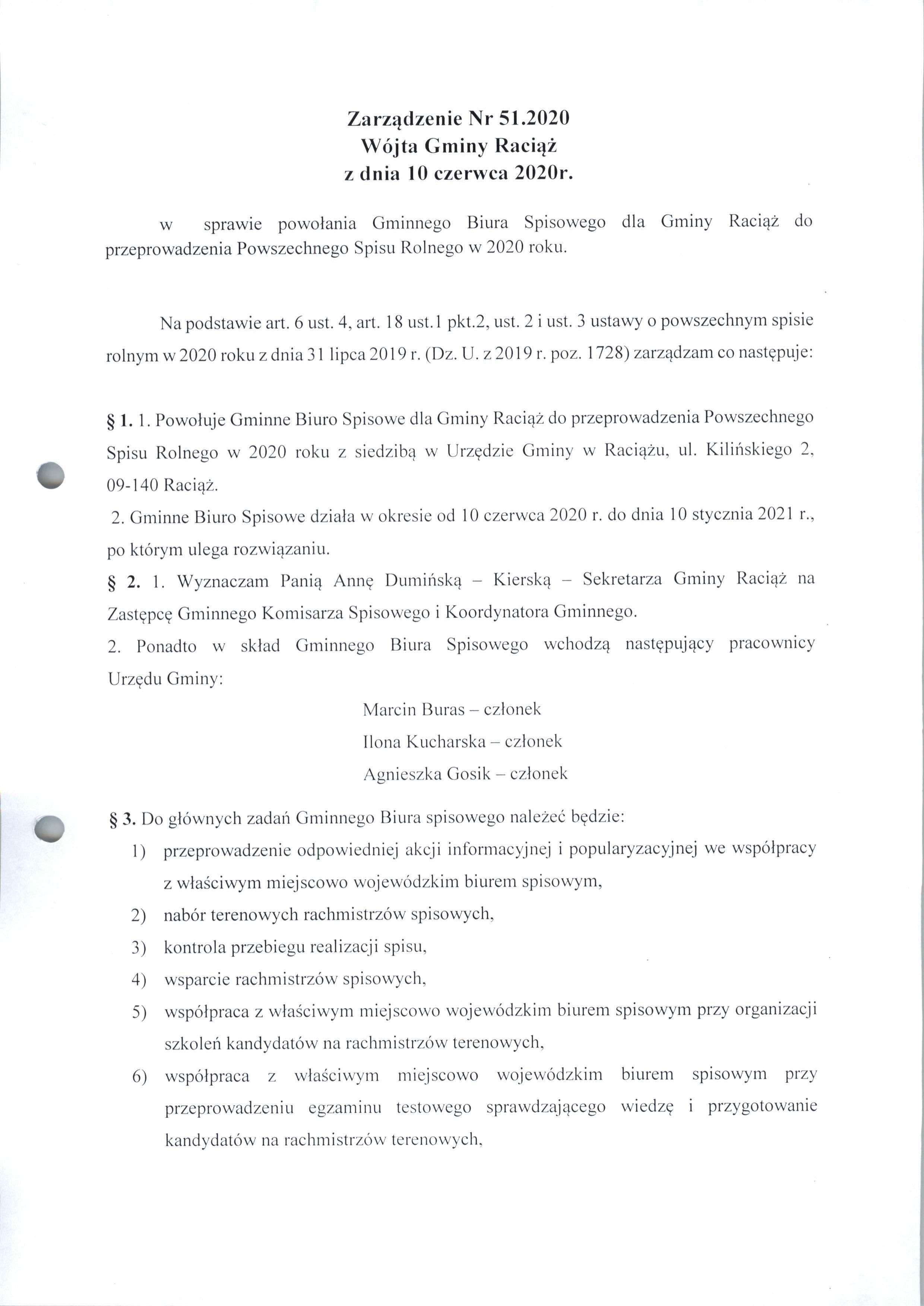 Zarządzenie Nr 51.2020 Wójta Gminy Raciąż z dnia 10 czerwca 2020 roku