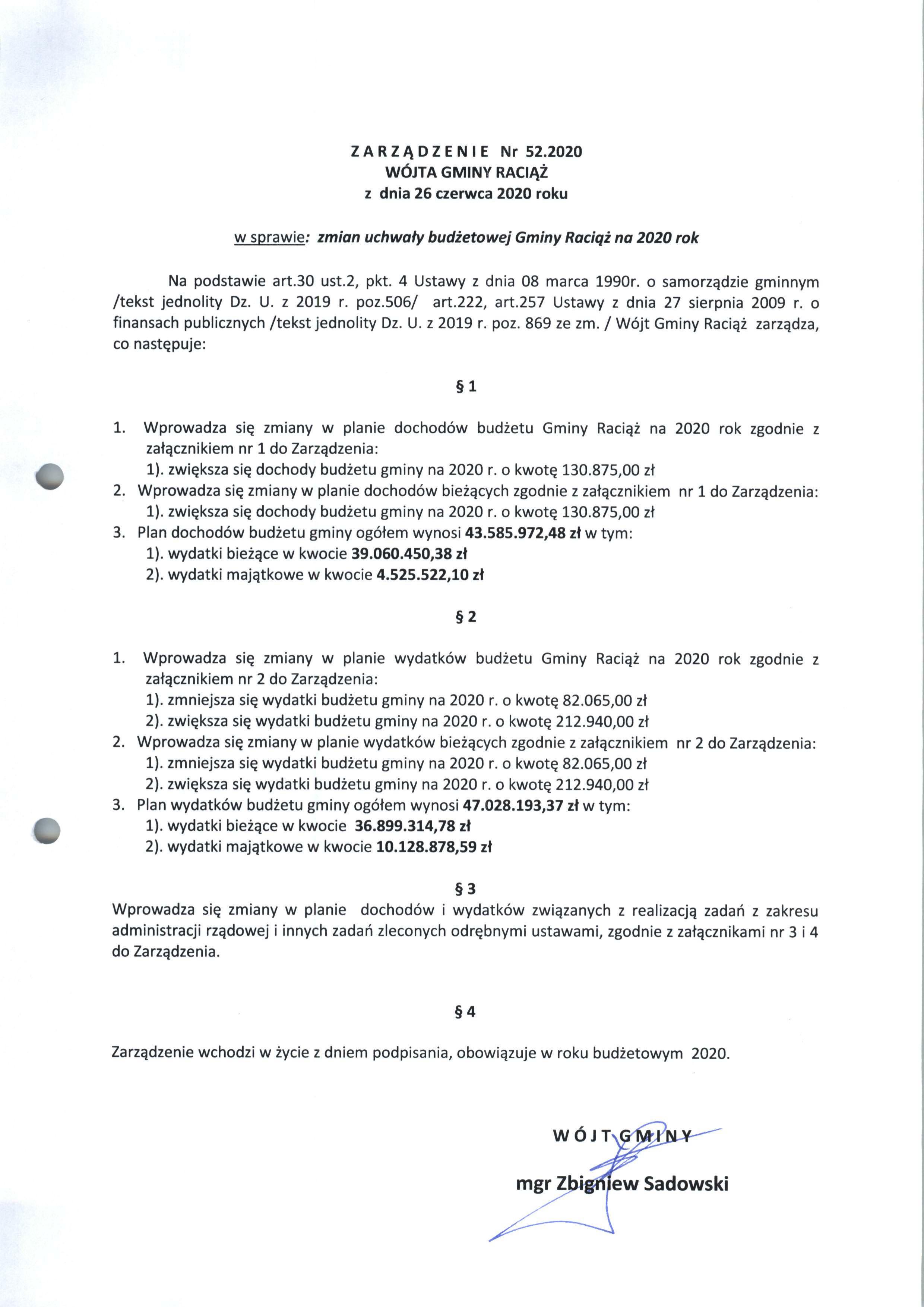 Zarządzenie Nr 52.2020 Wójta Gminy Raciąż z dnia 26 czerwca 2020 roku