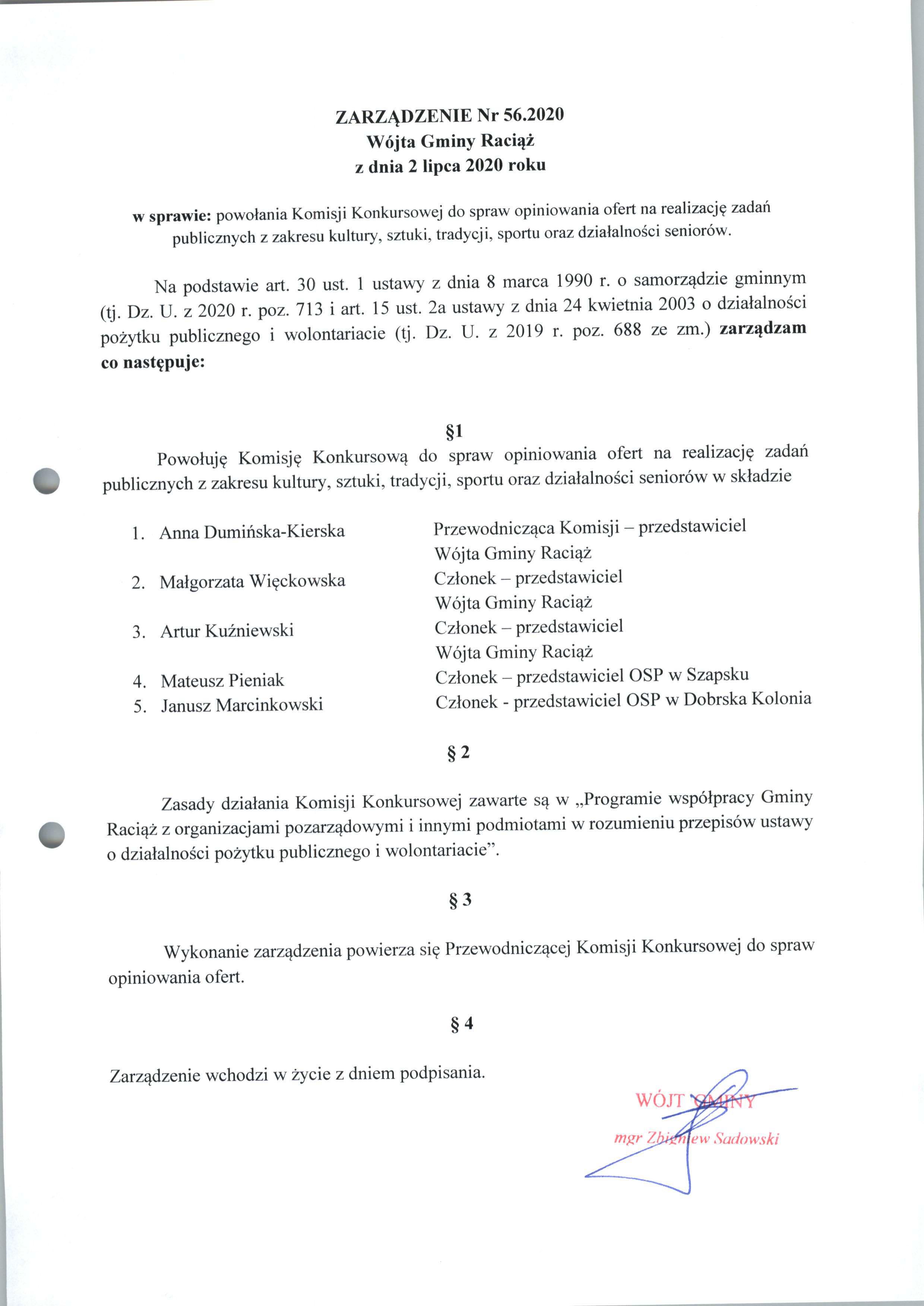 Zarządzenie Nr 56.2020 Wójta Gminy Raciąż z dnia 02 lipca 2020 roku
