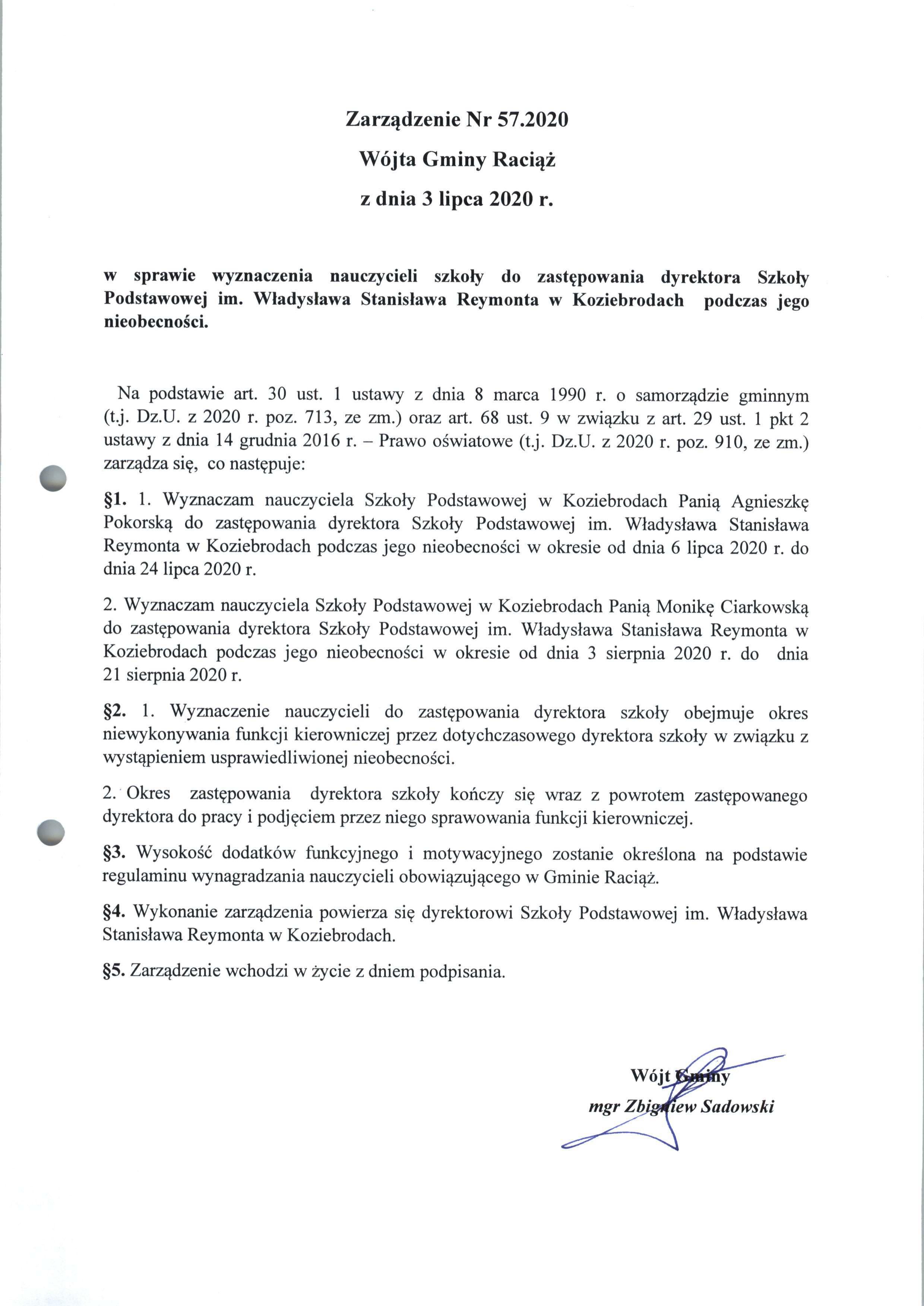 Zarządzenie Nr 57.2020 Wójta Gminy Raciąż z dnia 03 lipca 2020 roku