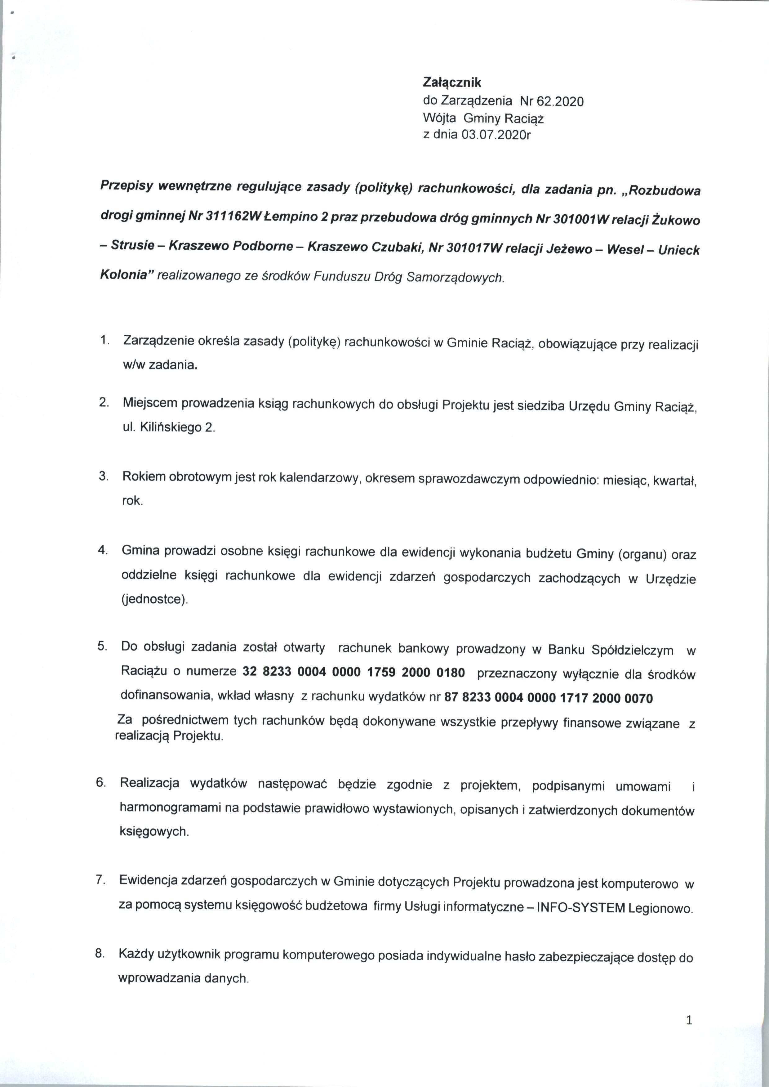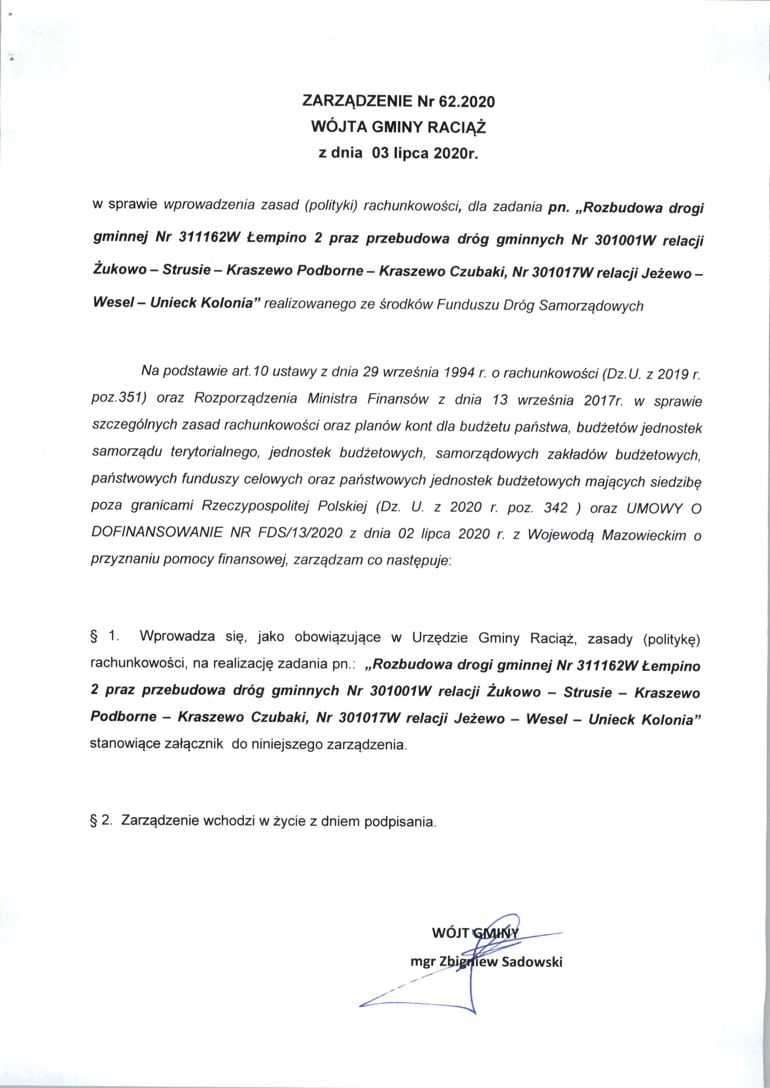 Zarządzenie Nr 62.2020 Wójta Gminy Raciąż z dnia 03 lipca 2020 roku