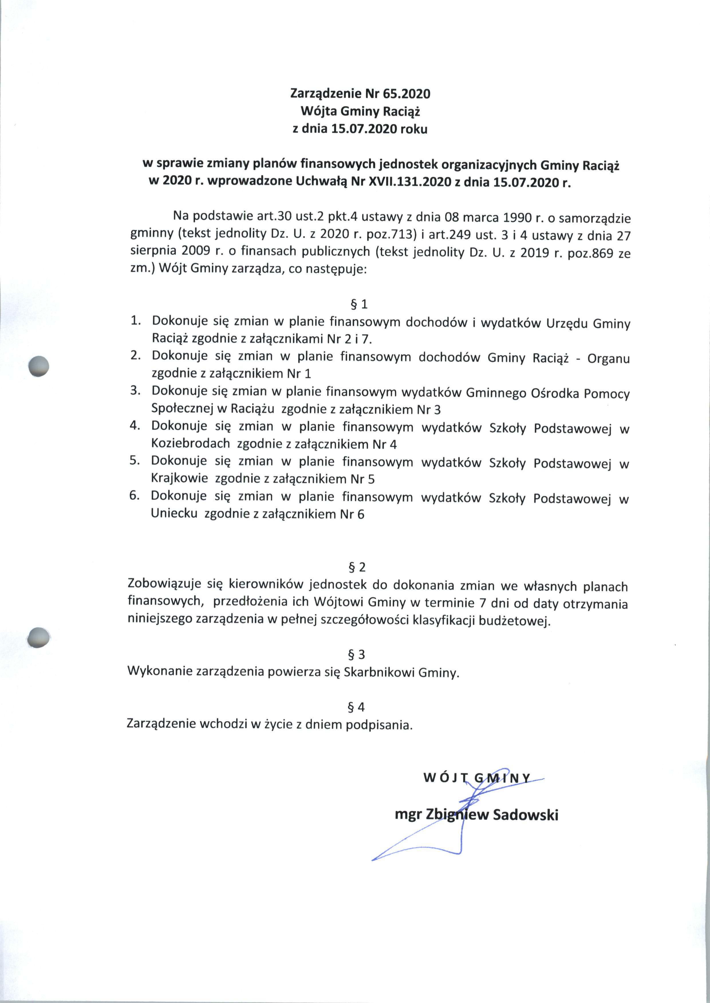 Zarządzenie Nr 65.2020 Wójta Gminy Raciąż z dnia 15 lipca 2020 roku