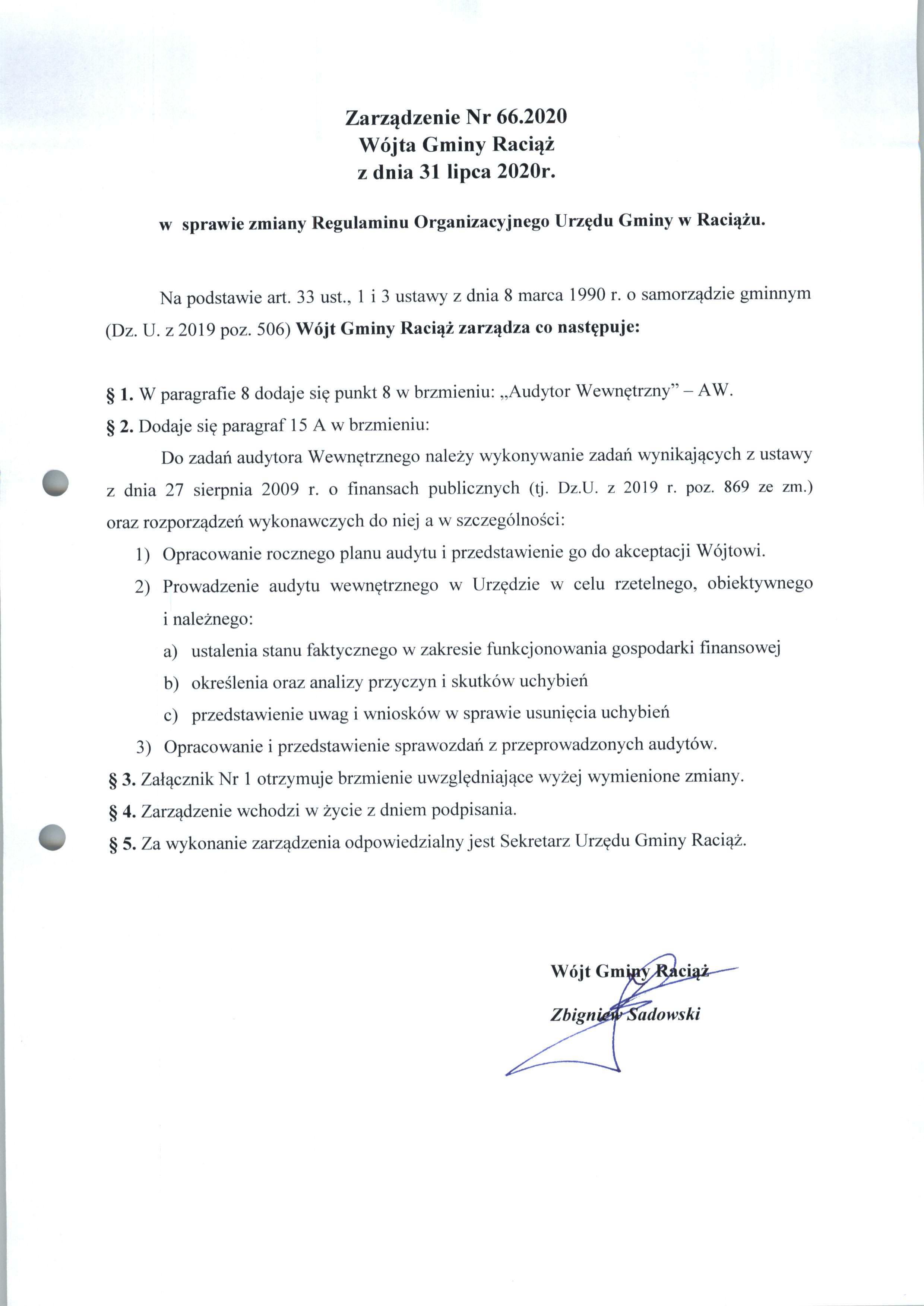 Zarządzenie Nr 66.2020 Wójta Gminy Raciąż z dnia 31 lipca 2020 roku