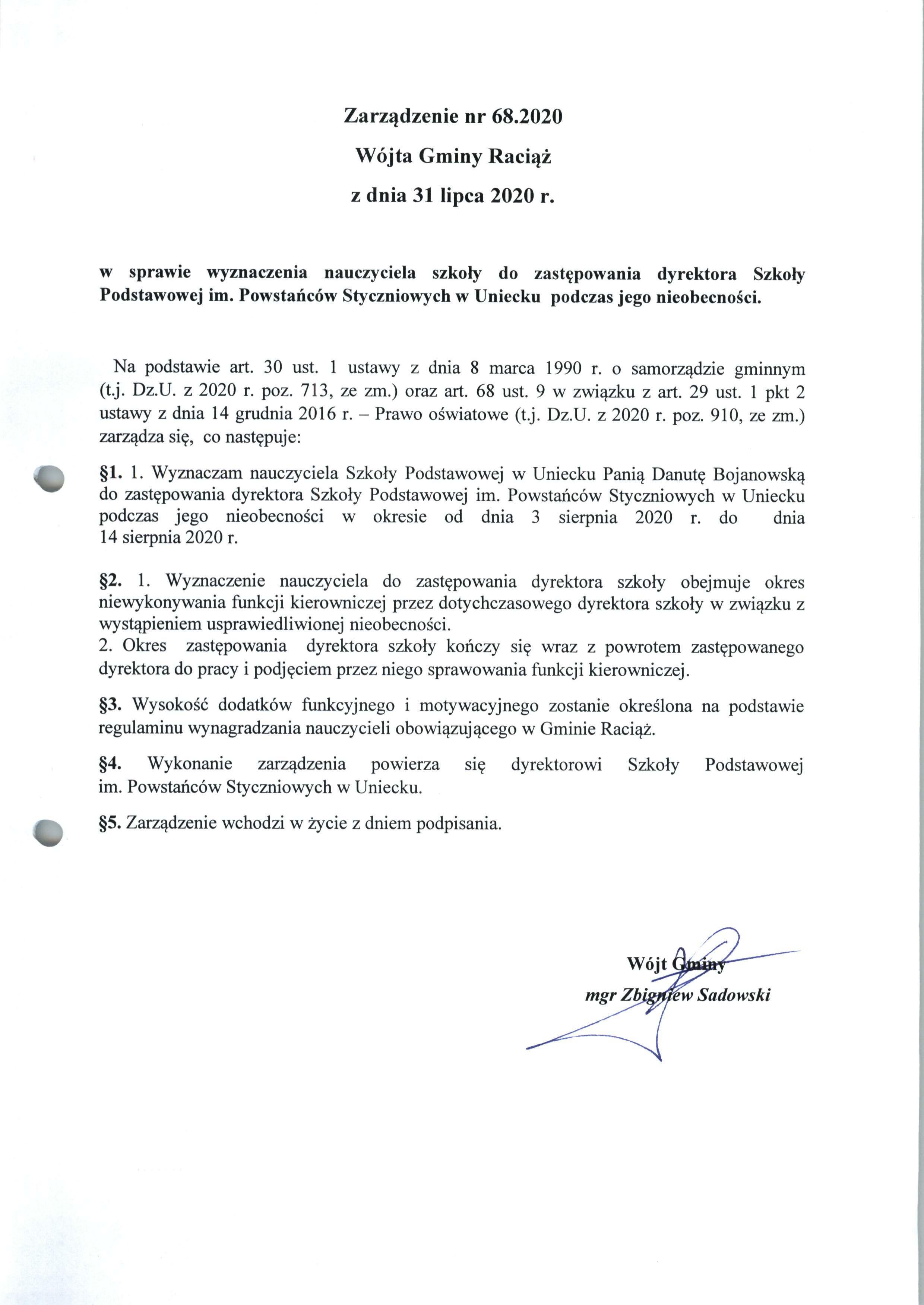 Zarządzenie Nr 68.2020 Wójta Gminy Raciąż z dnia 31 lipca 2020 roku