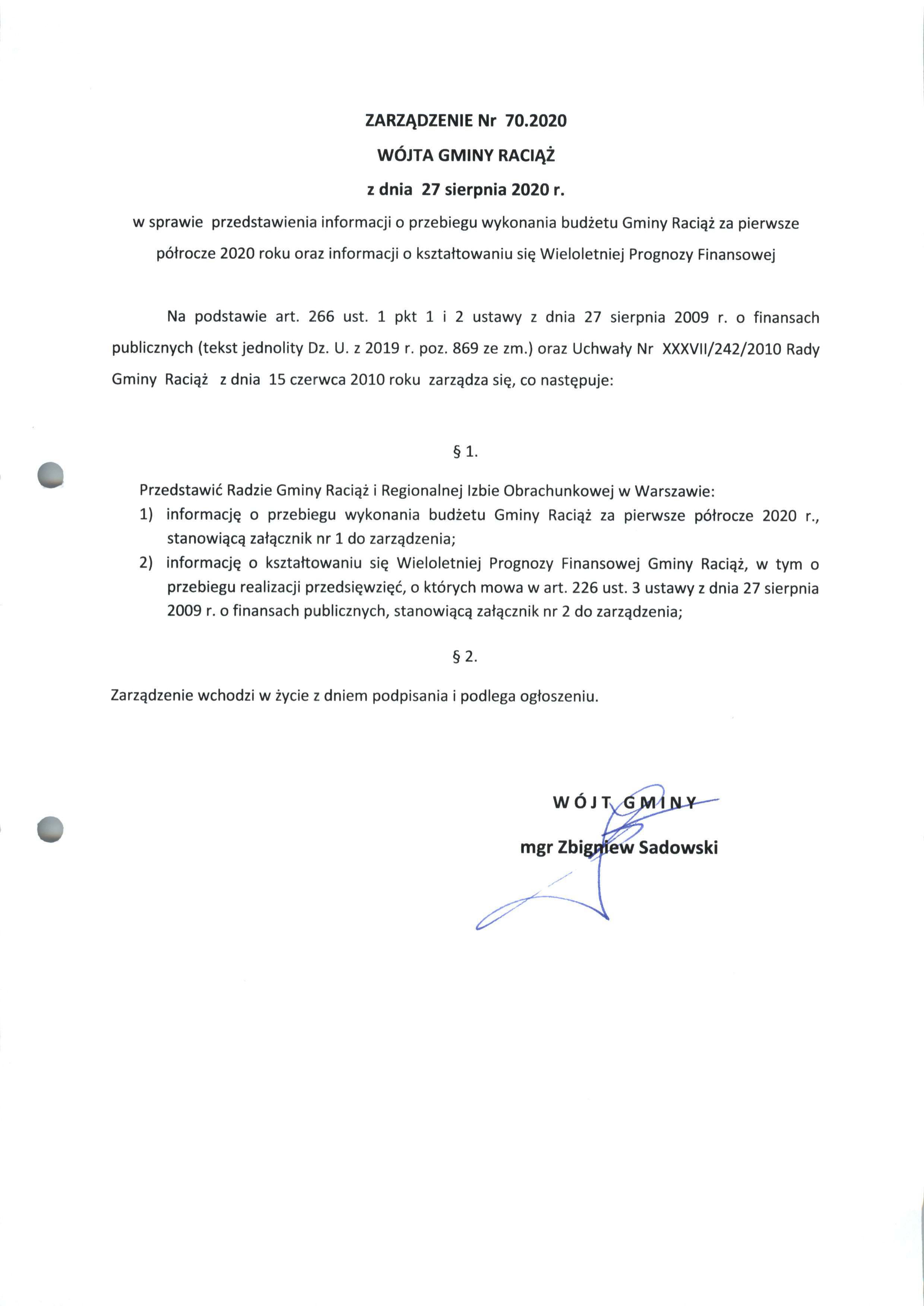 Zarządzenie Nr 70.2020 Wójta Gminy Raciąż z dnia 27 sierpnia 2020 roku