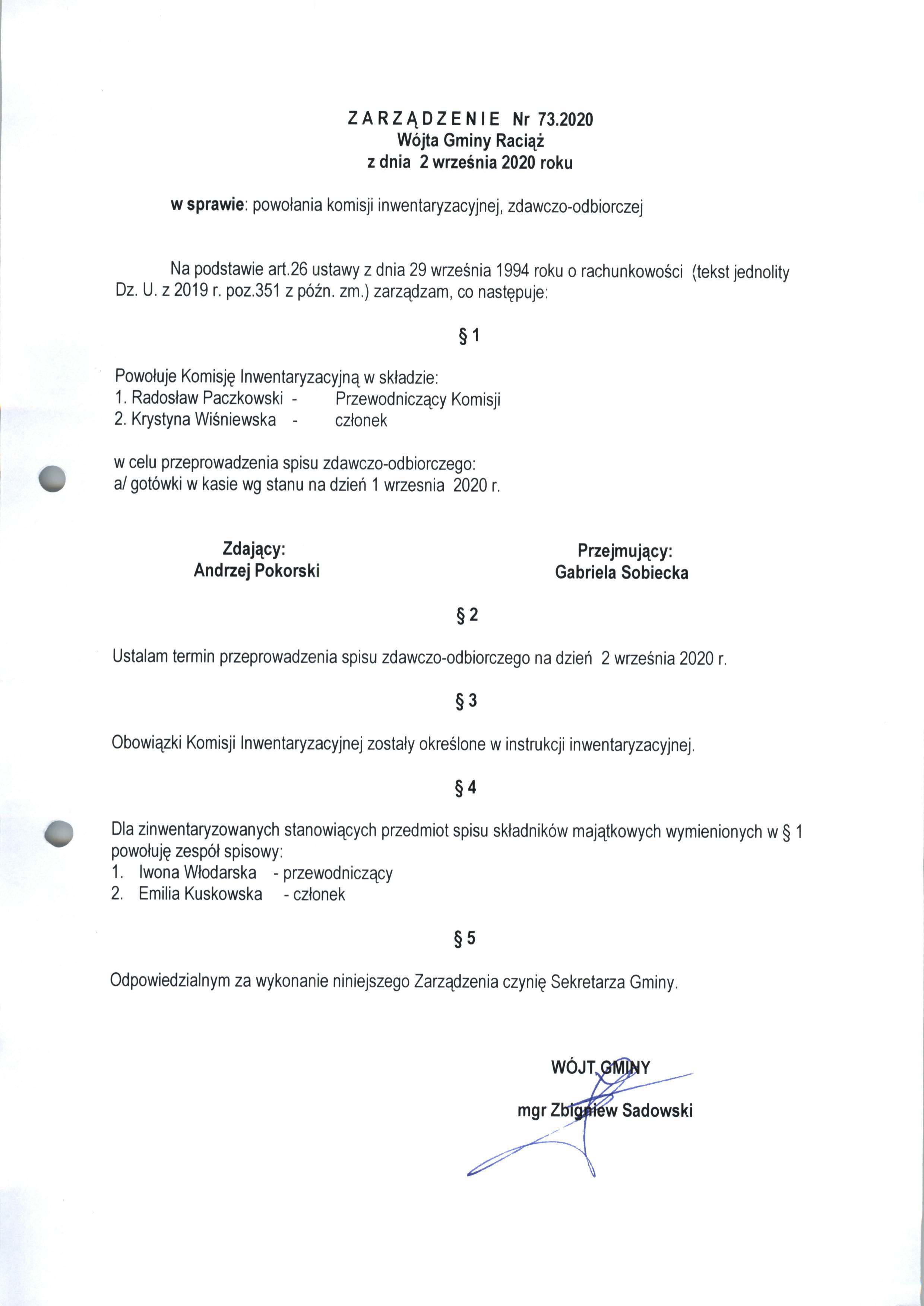 Zarządzenie Nr 73.2020 Wójta Gminy Raciąż z dnia 2 września 2020 roku