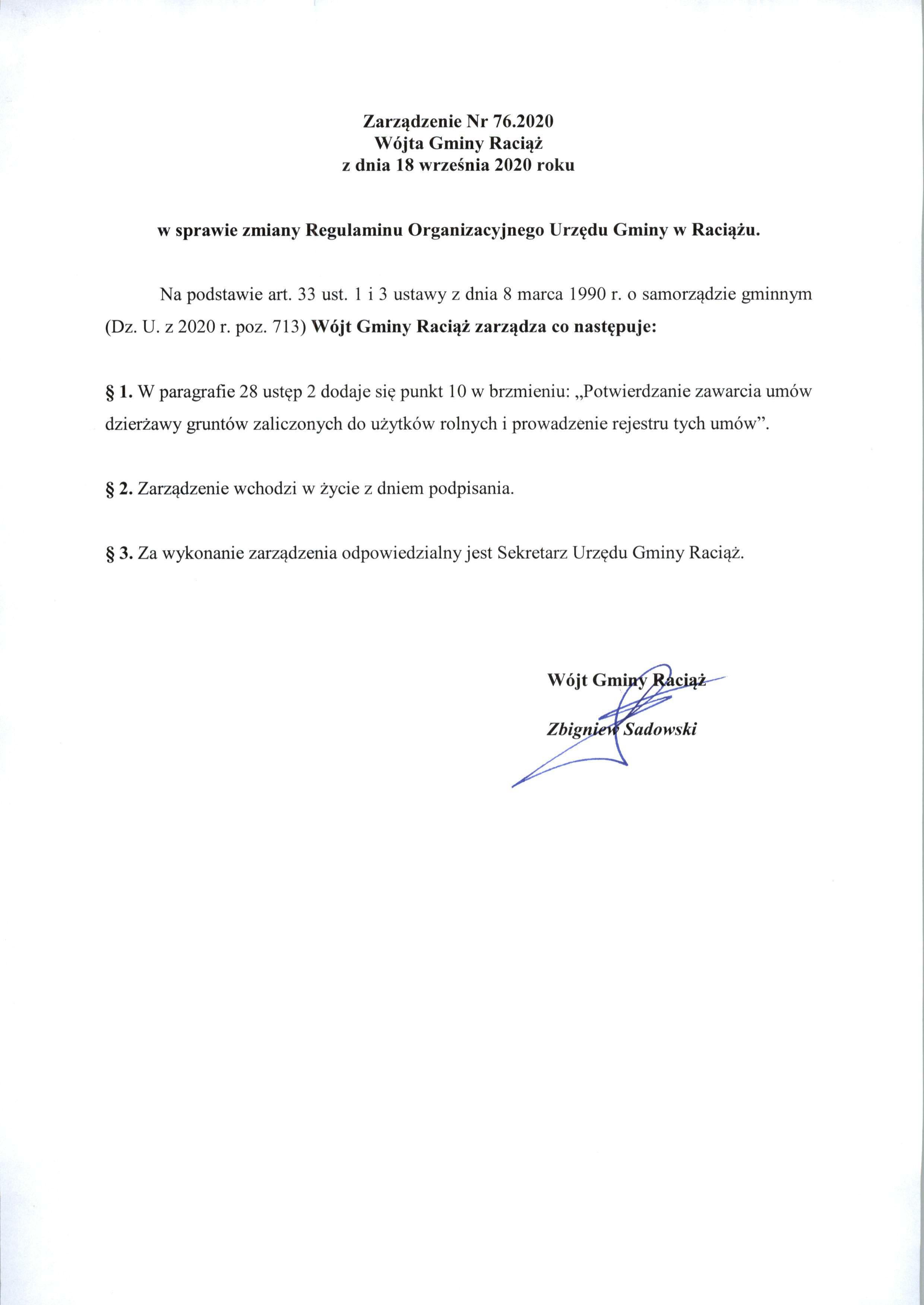 Zarządzenie Nr 76.2020 Wójta Gminy Raciąż z dnia 18 września 2020 roku