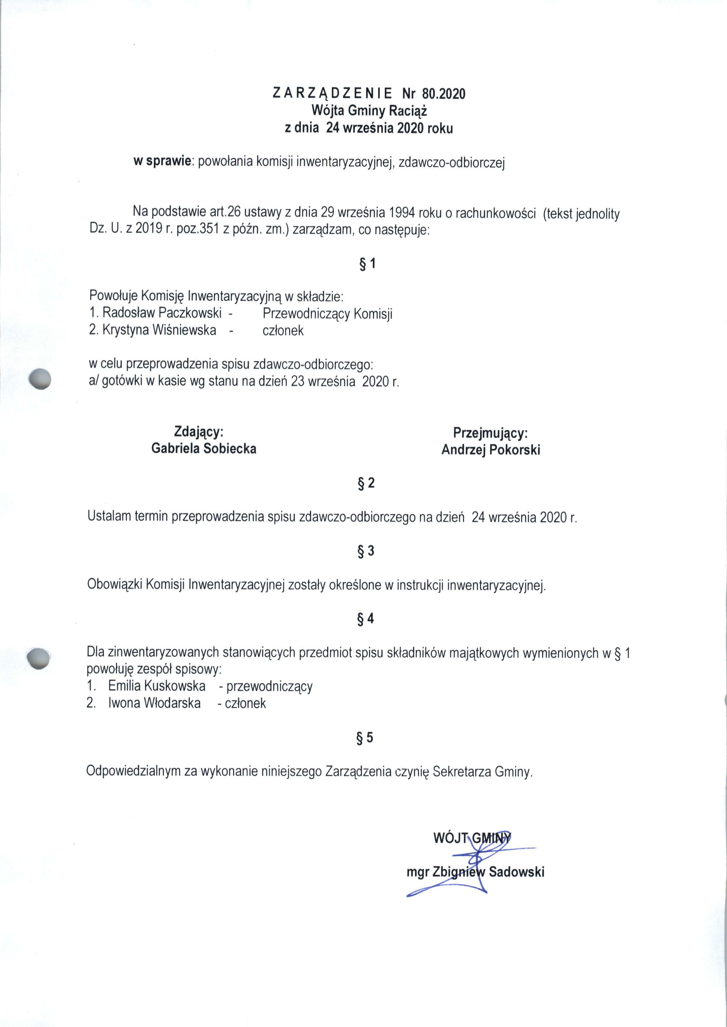Zarządzenie Nr 80.2020 Wójta Gminy Raciąż z dnia 24 września 2020 roku