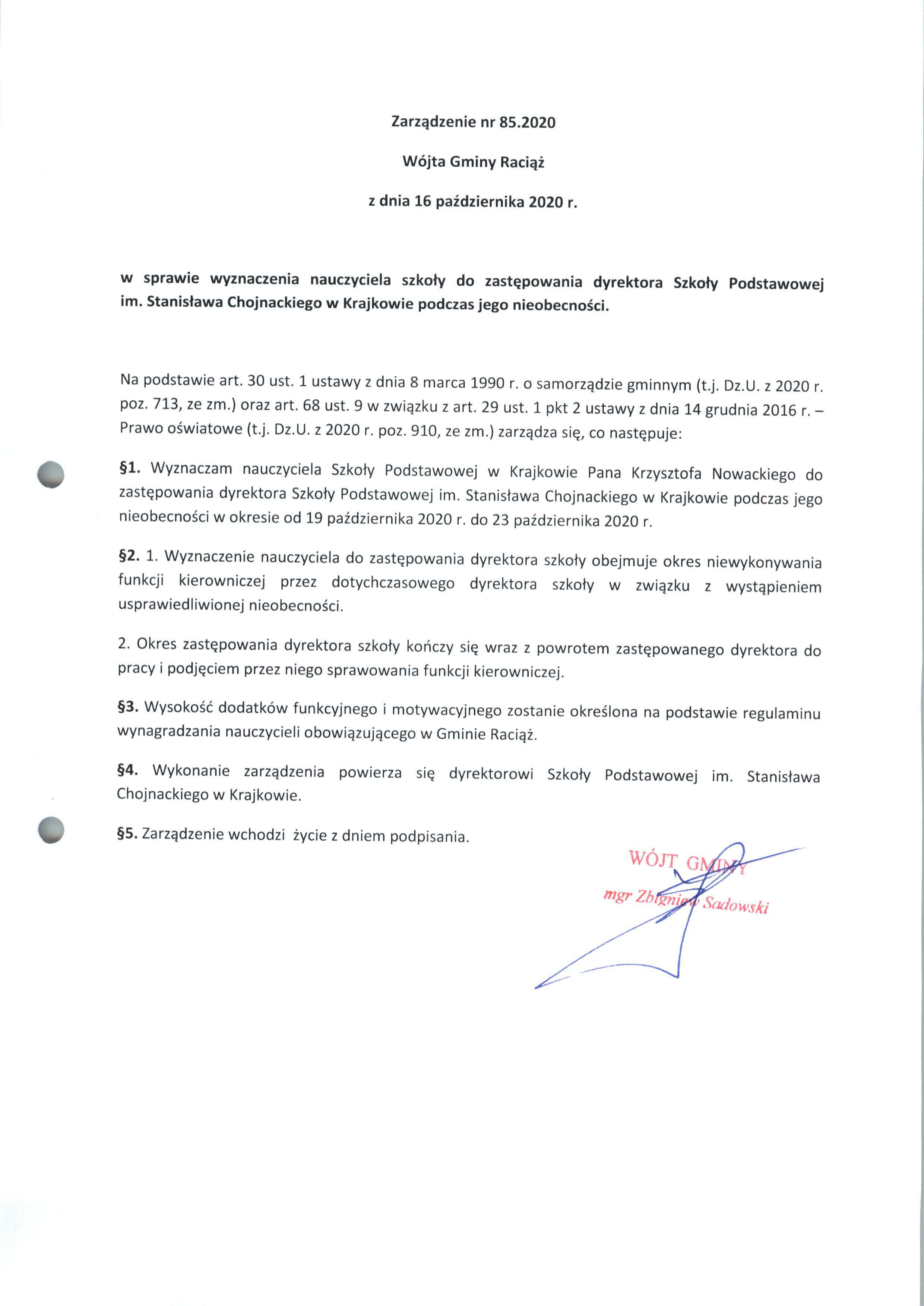 Zarządzenie Nr 85.2020 Wójta Gminy Raciąż z dnia 16 października 2020 roku