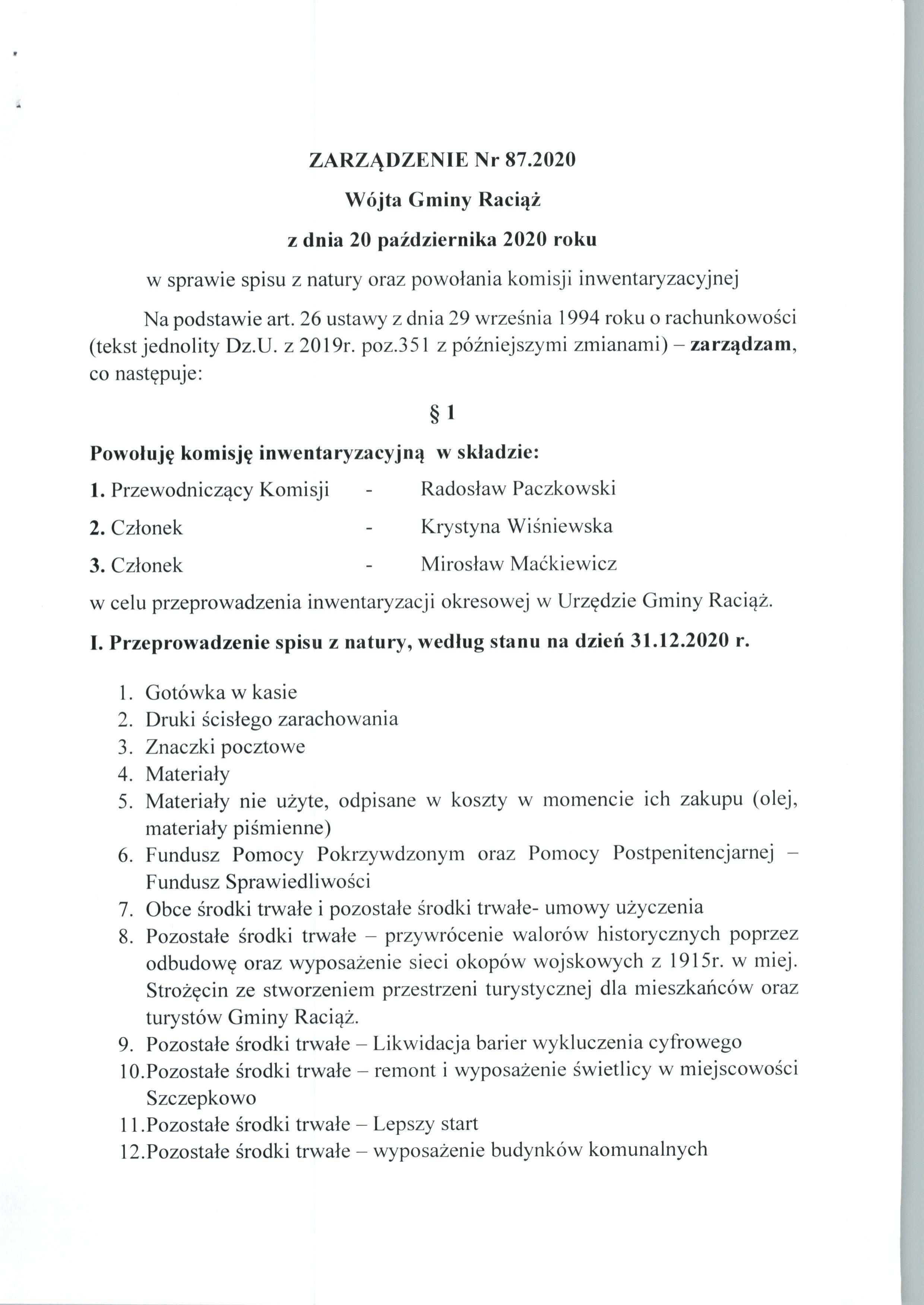 Zarządzenie Nr 87.2020 Wójta Gminy Raciąż z dnia 20 października 2020 roku