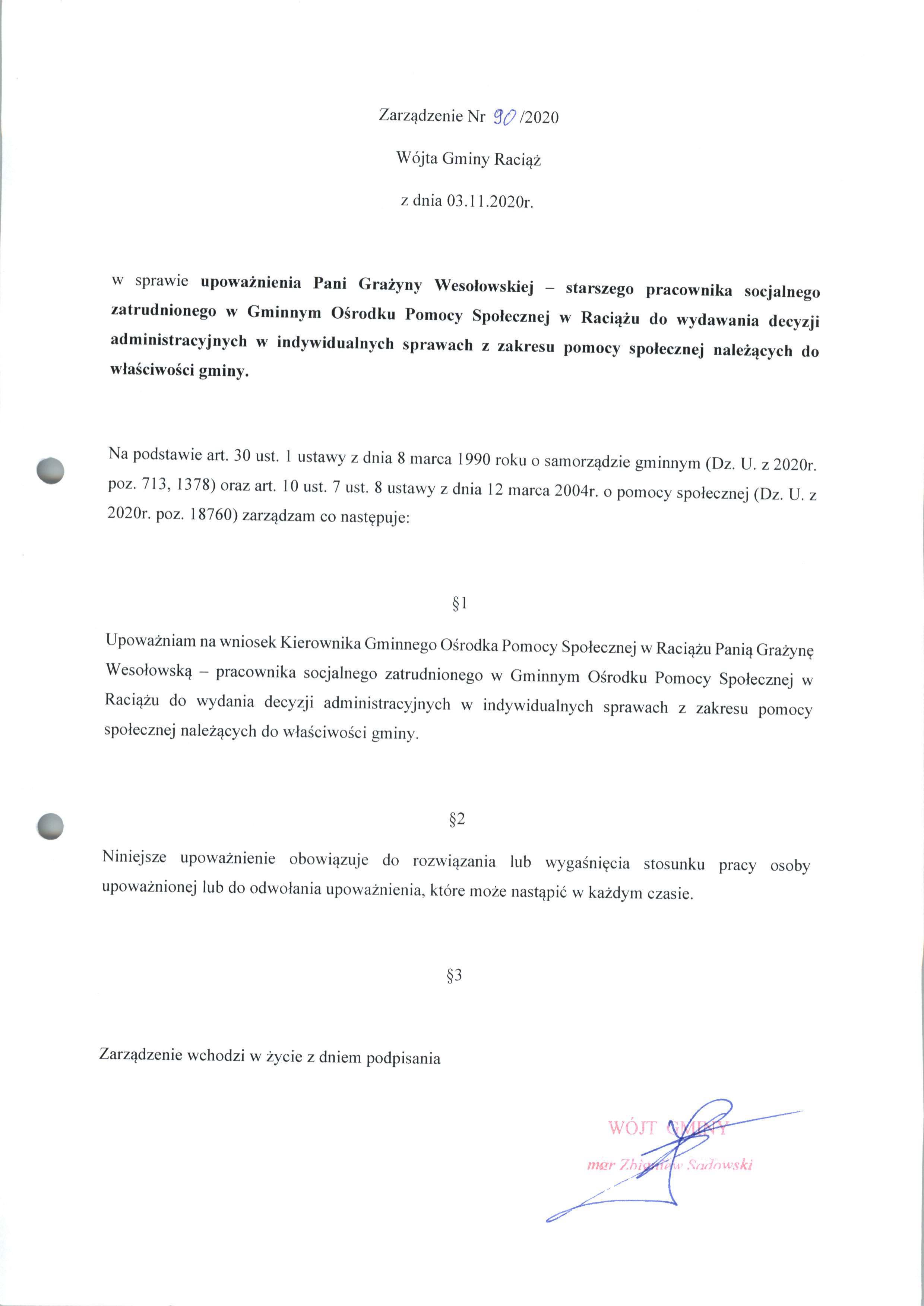 Zarządzenie Nr 90.2020 Wójta Gminy Raciąż z dnia 3 listopada 2020 roku