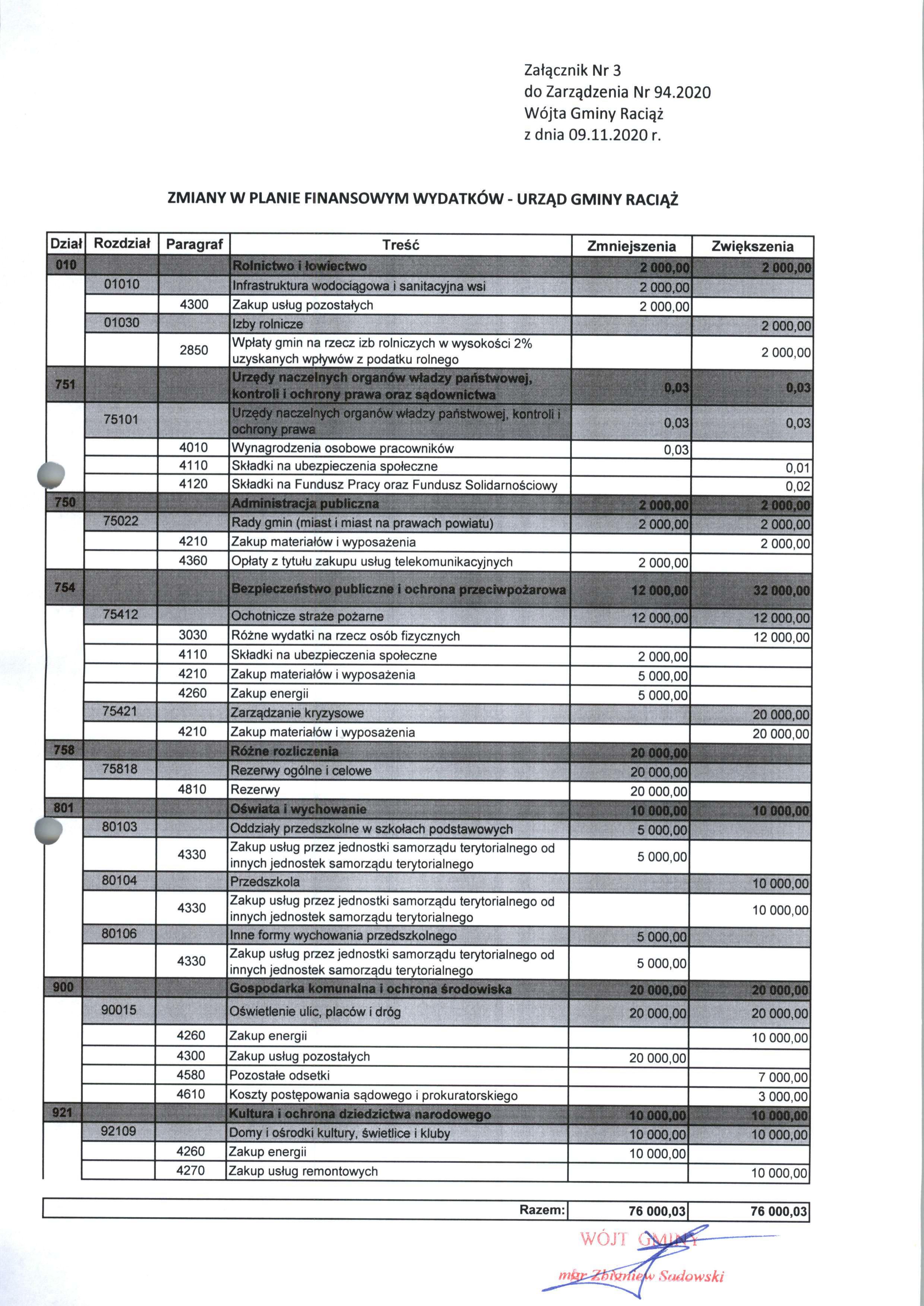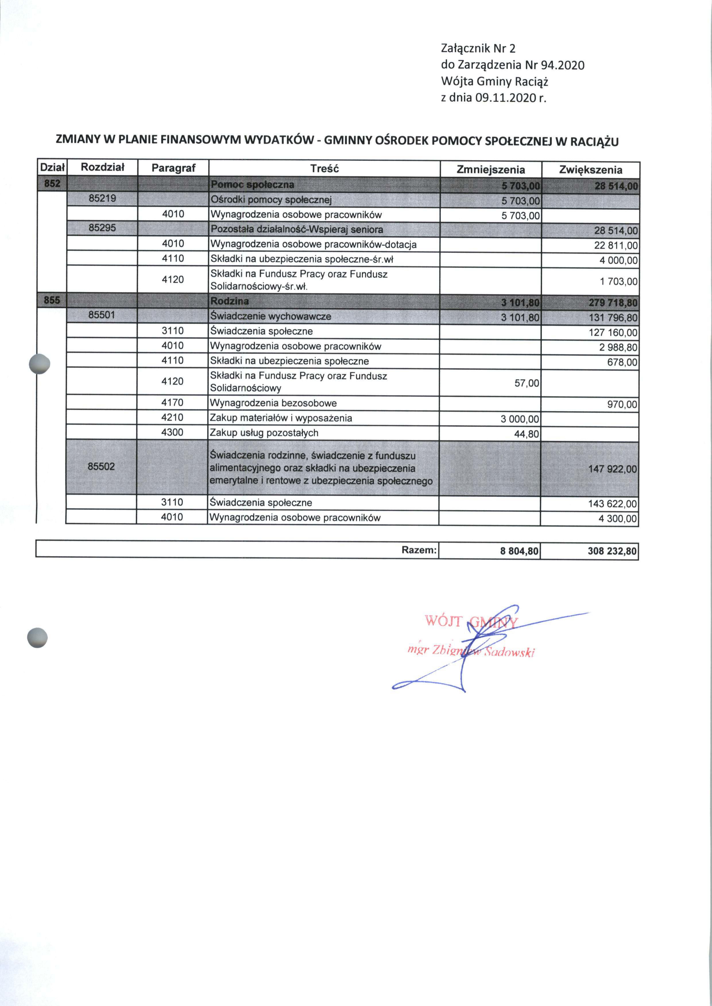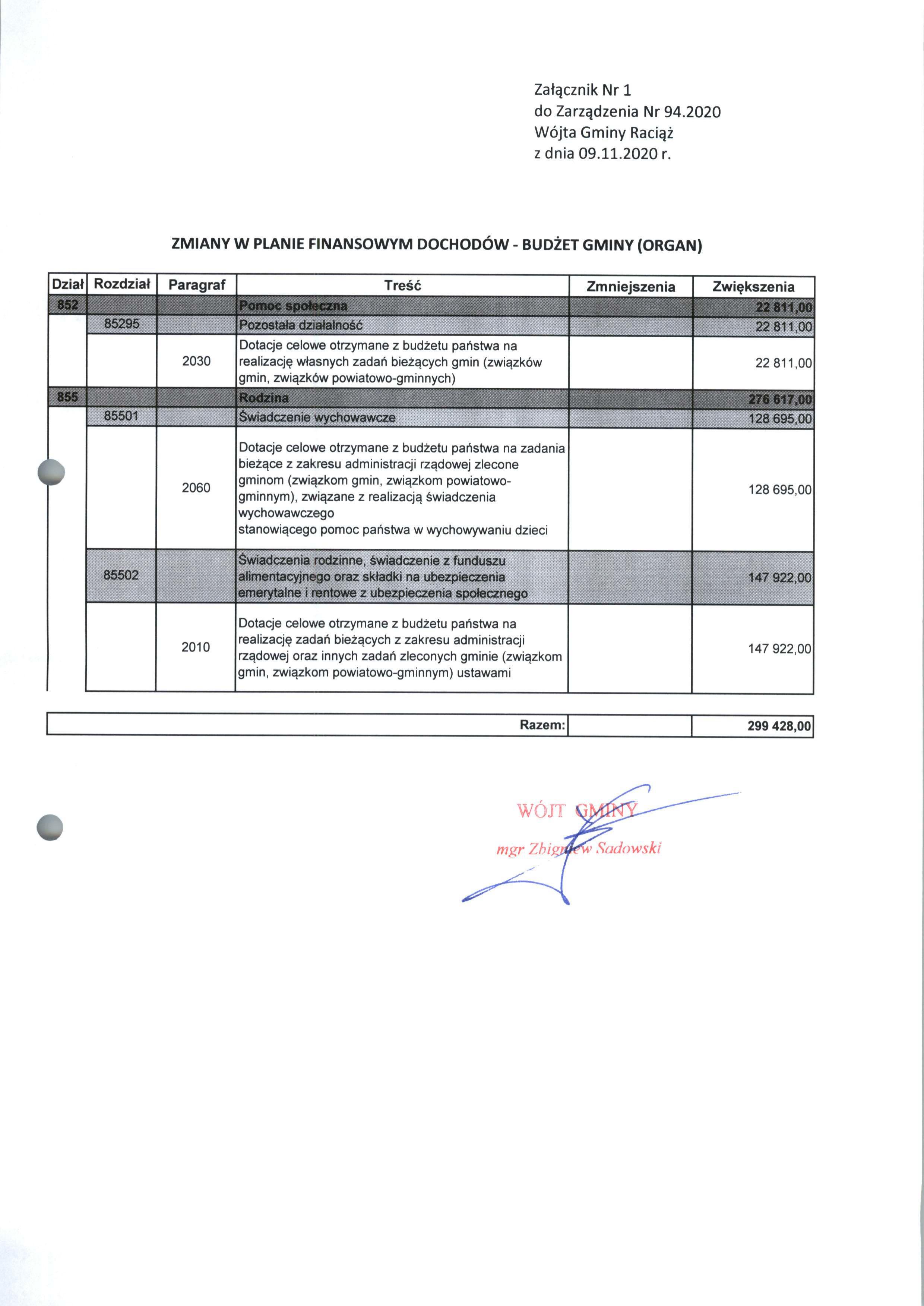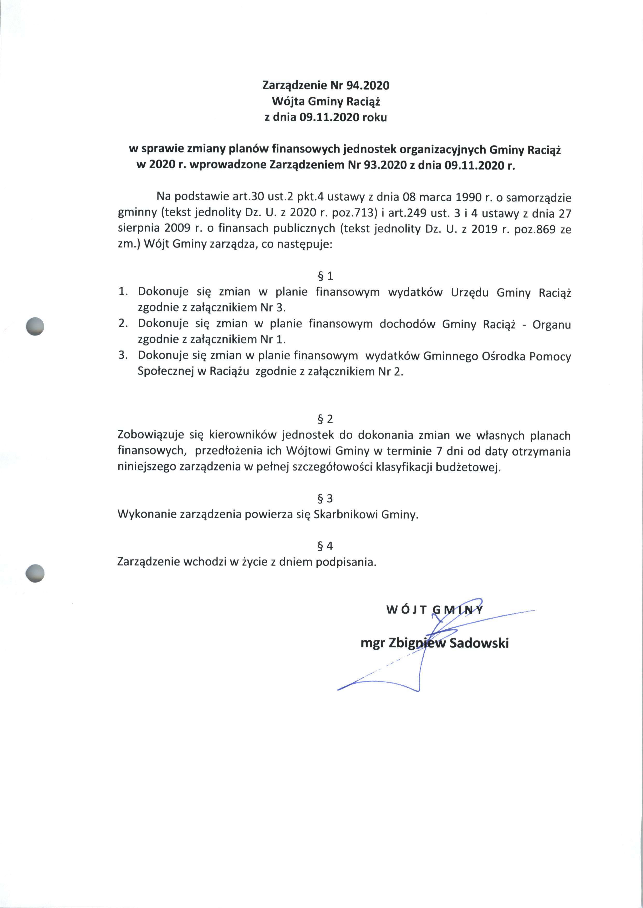 Zarządzenie Nr 94.2020 Wójta Gminy Raciąż z dnia 9 listopada 2020 roku