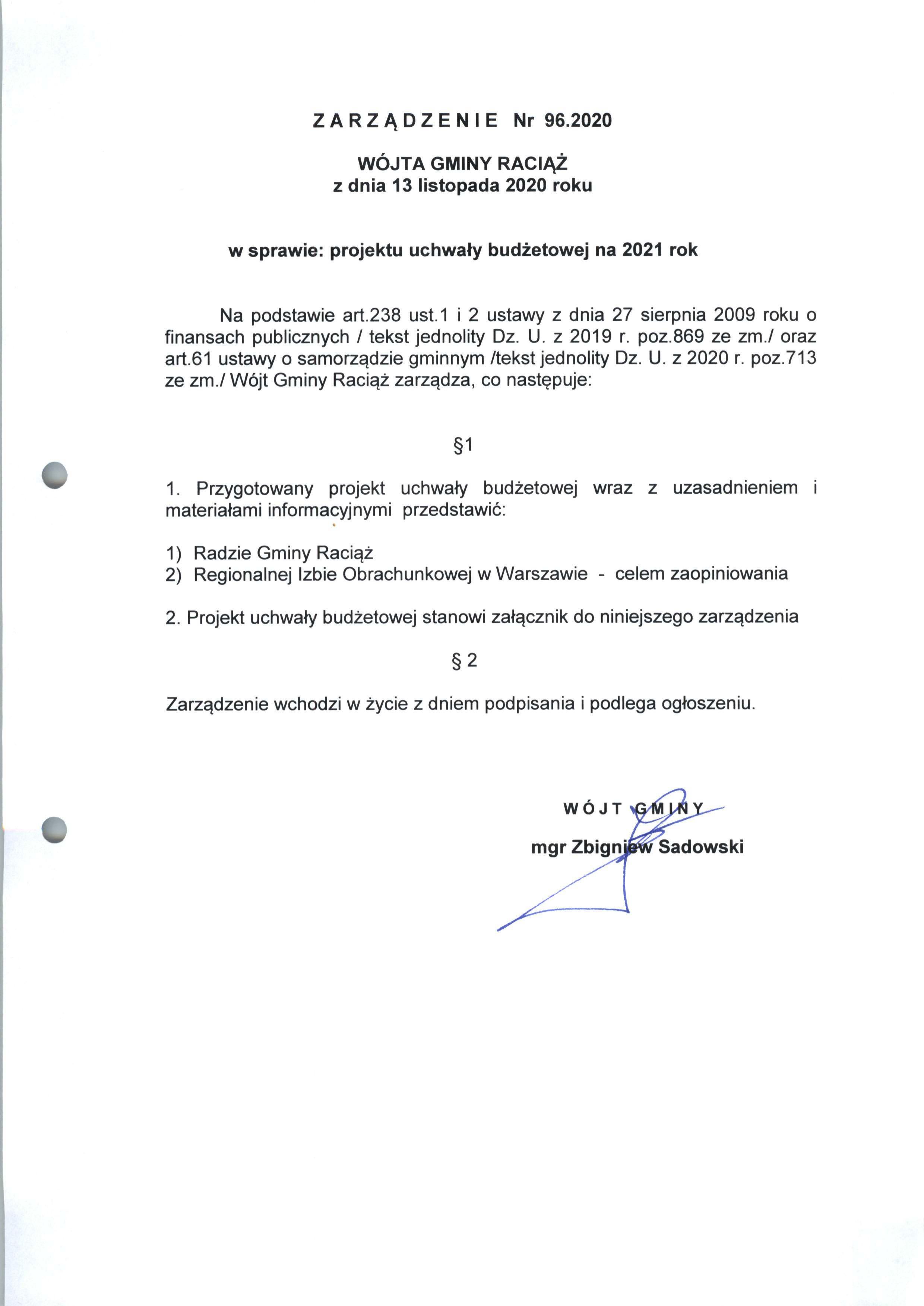 Zarządzenie Nr 96.2020 Wójta Gminy Raciąż z dnia 13 listopada 2020 roku