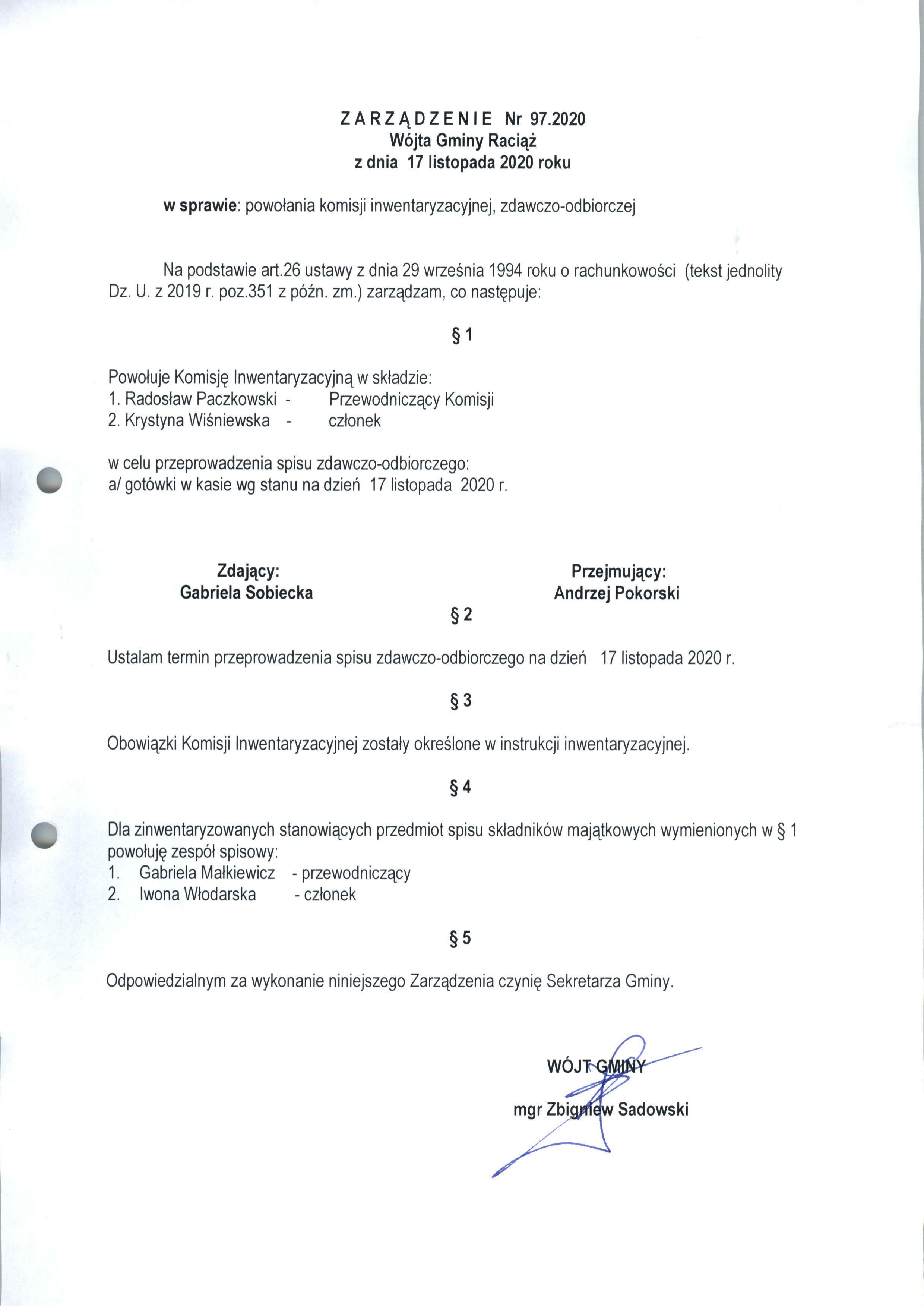 Zarządzenie Nr 97.2020 Wójta Gminy Raciąż z dnia 17 listopada 2020 roku