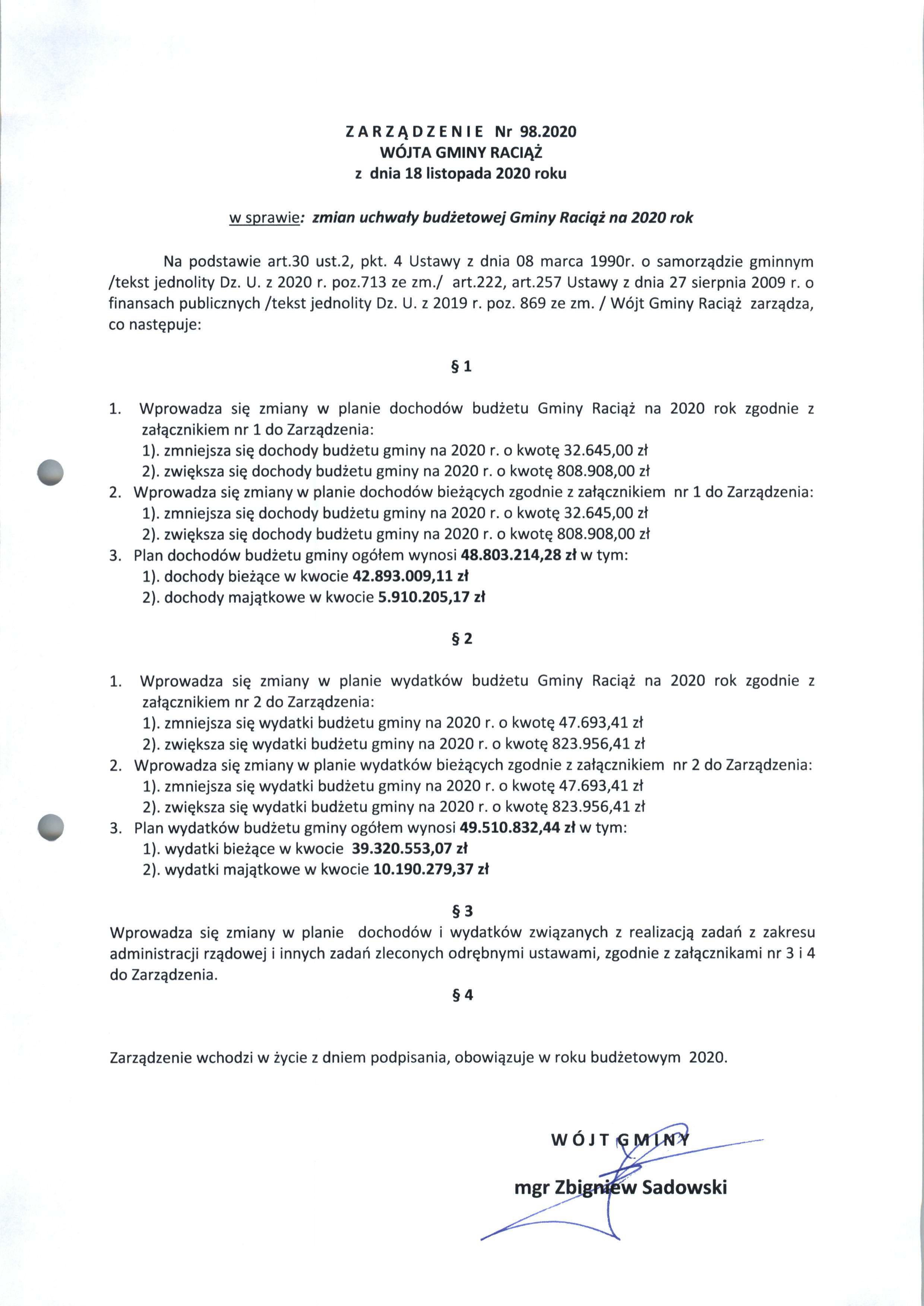 Zarządzenie Nr 98.2020 Wójta Gminy Raciąż z dnia 18 listopada 2020 roku