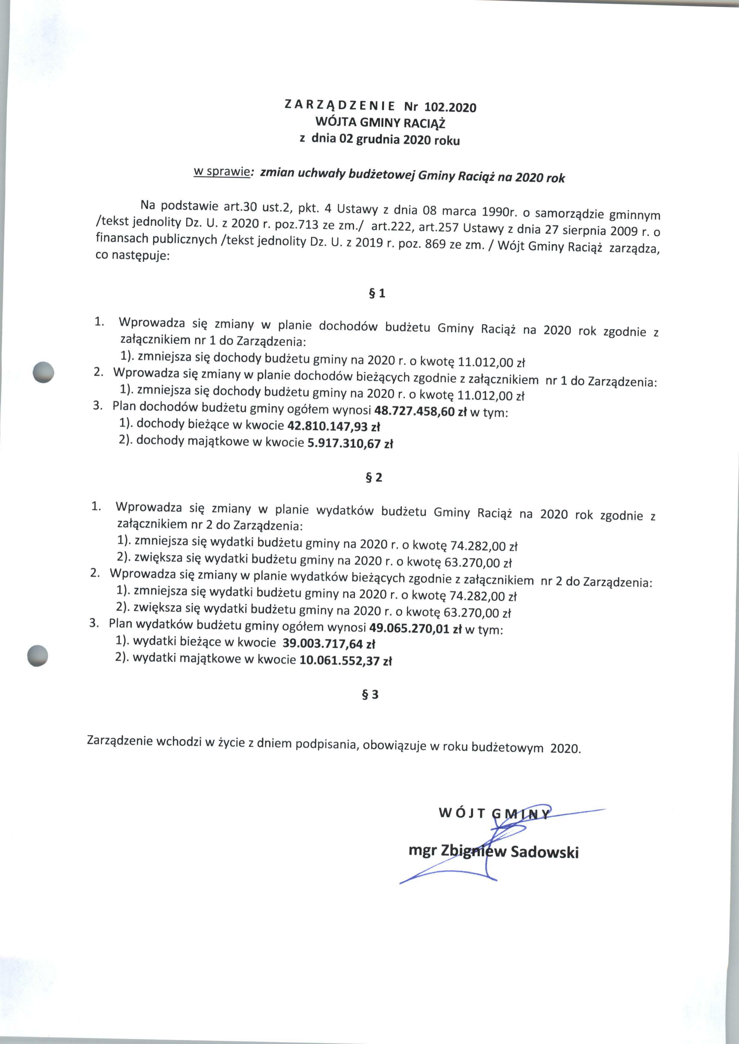 Zarządzenie Nr 102.2020 Wójta Gminy Raciąż z dnia 02 grudnia 2020 roku
