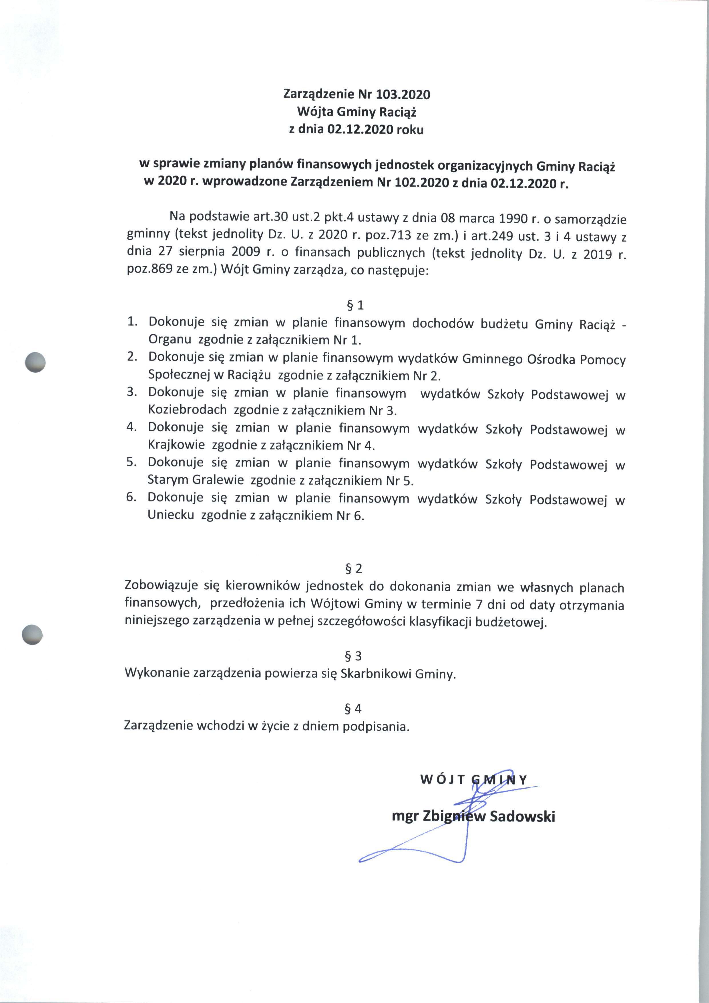 Zarządzenie Nr 103.2020 Wójta Gminy Raciąż z dnia 02 grudnia 2020 roku