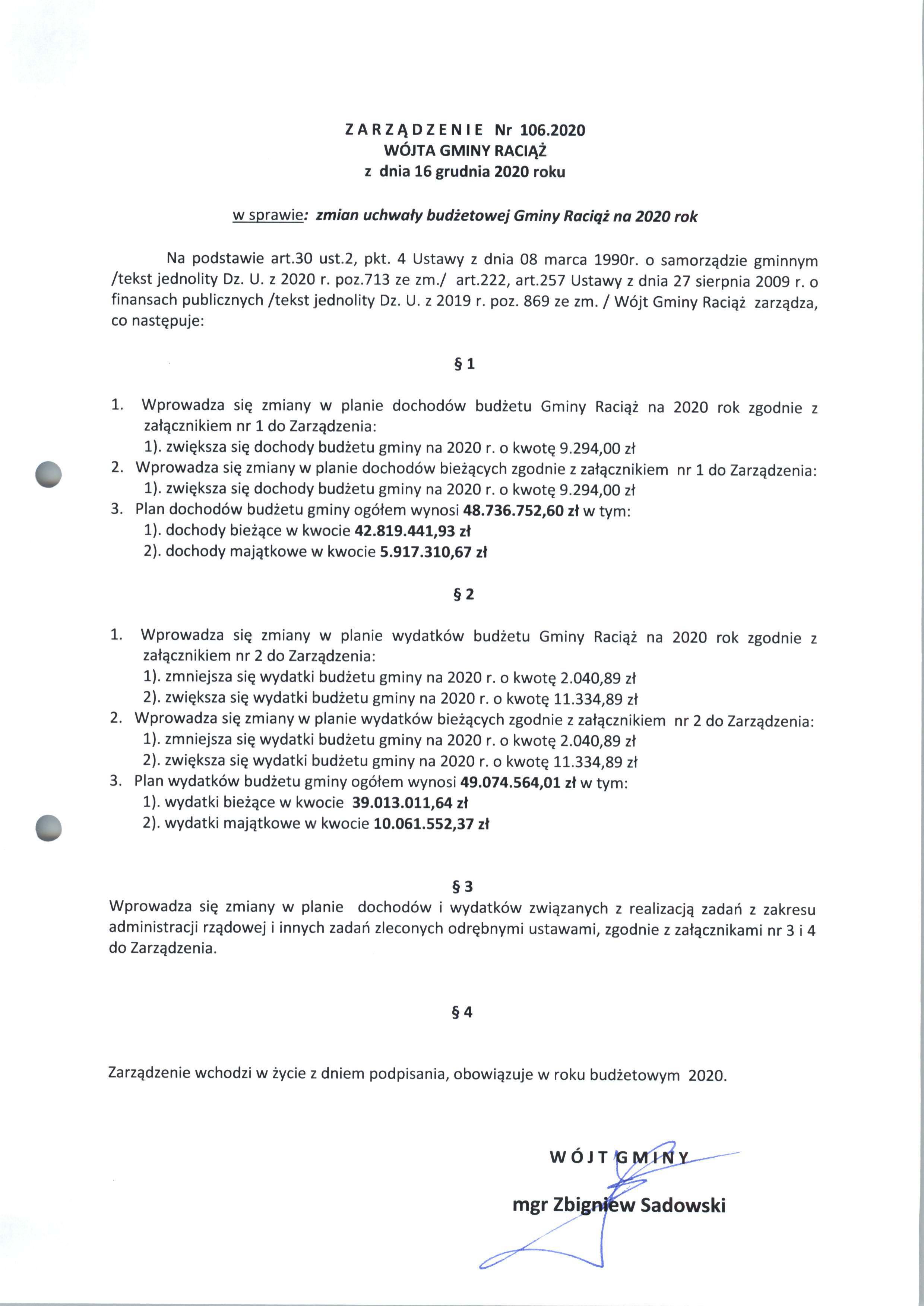 Zarządzenie Nr 106.2020 Wójta Gminy Raciąż z dnia 16 grudnia 2020 roku