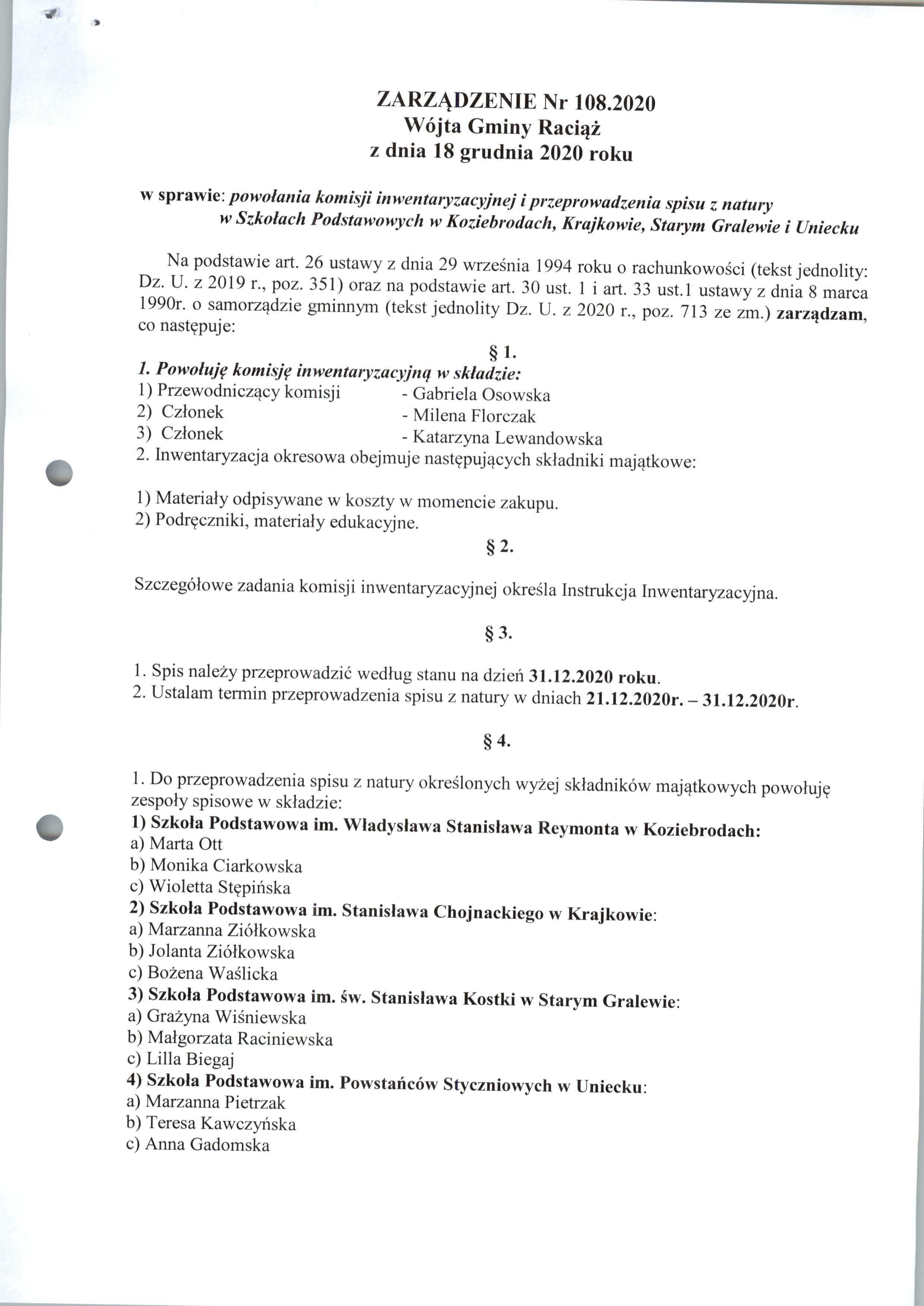 Zarządzenie Nr 108.2020 Wójta Gminy Raciąż z dnia 18 grudnia 2020 roku